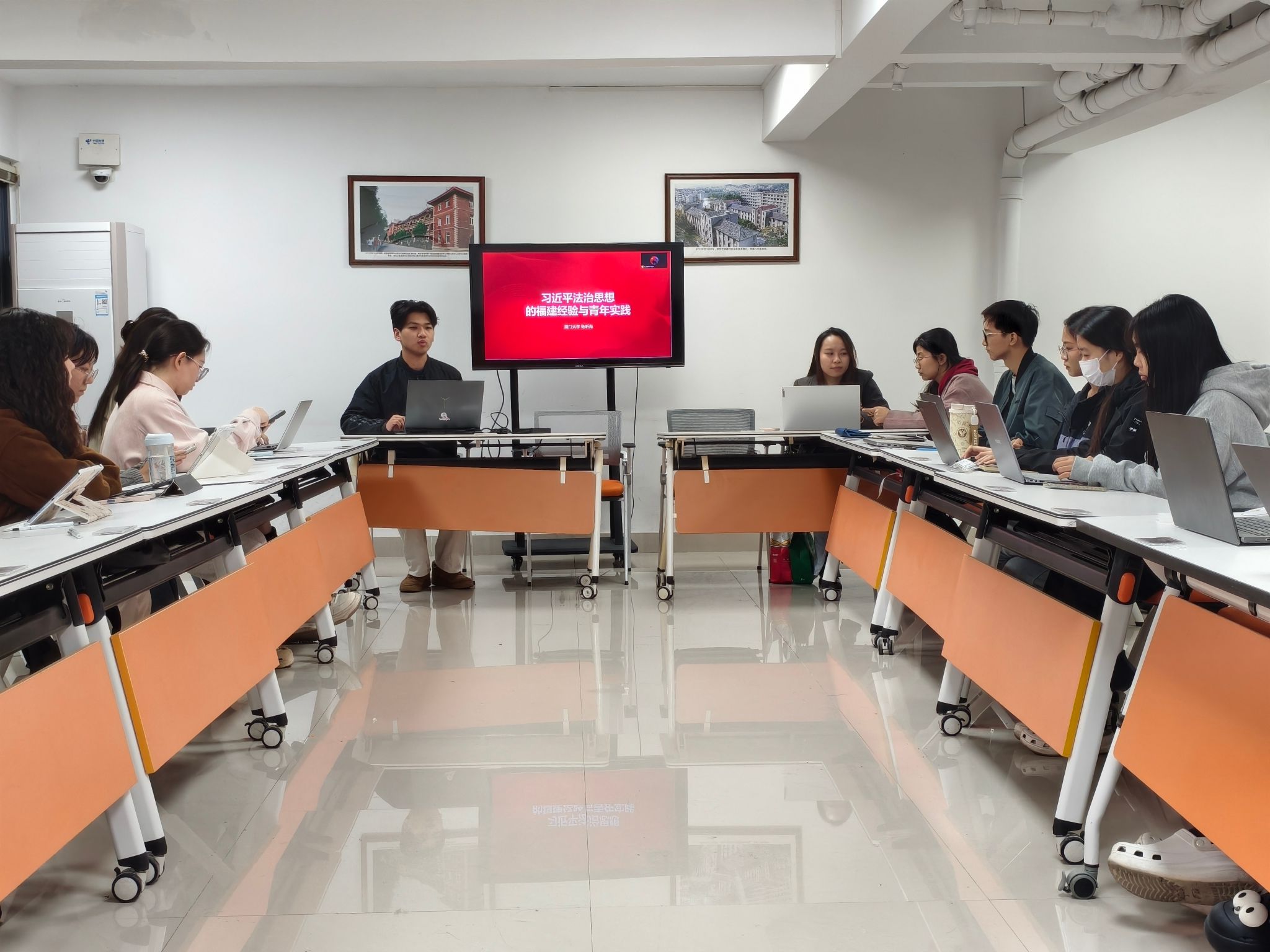 与会成员进行交流讨论。法学硕士生第二党支部张清兰认为,作为法学青年,要深入学习贯彻习近平法治思想,不断提高自身理论水平,坚持不懈用党的创新理论武装头脑、指导实践、推动工作。党规党纪学生研习社党支部张云齐分享了自己对“拔烂树、扶歪树、治病树”和“不敢腐、不能腐、不想腐”这两句话的理解。