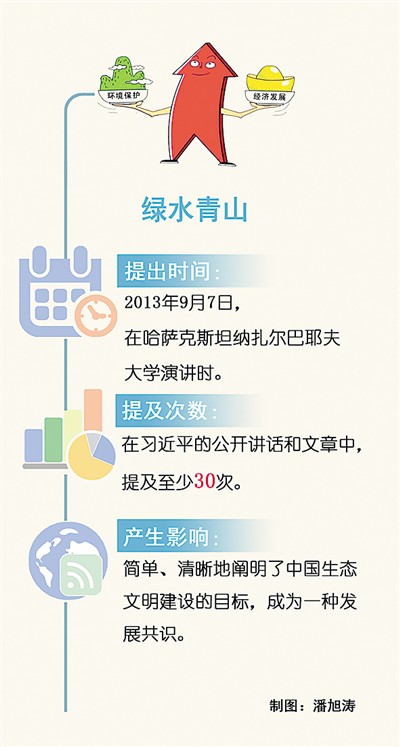 “我们追求人与自然的和谐、经济与社会的和谐,通俗地讲就是要 ‘两座山’:既要金山银山,又要绿水青山,绿水青山就是金山银山。”2013年9月7日,习近平在哈萨克斯坦纳扎尔巴耶夫大学发表演讲后回答学生提问时说,“我们绝不能以牺牲生态环境为代价换取经济的一时发展”。