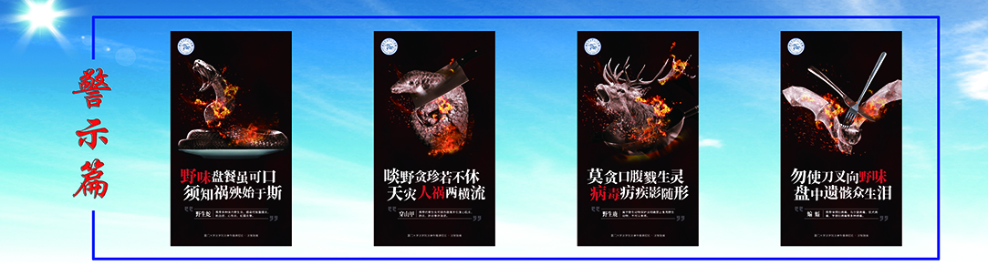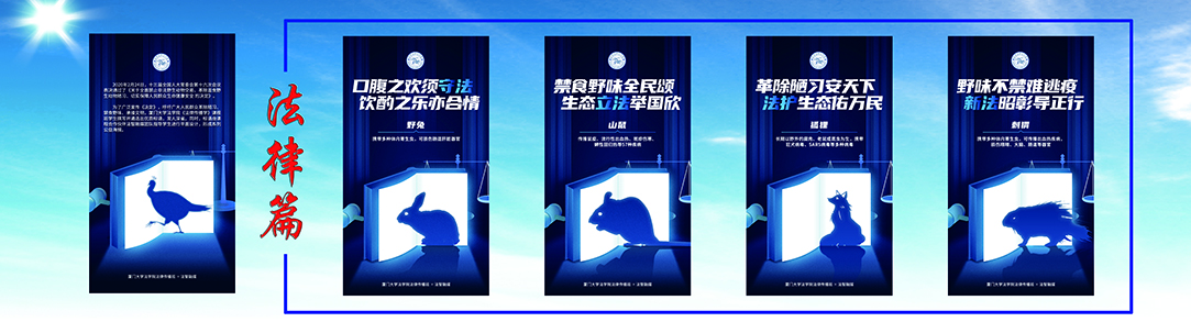 今年2月,我国发布了《关于全面禁止非法野生动物交易、革除滥食野生动物陋习、切实保障人民群众生命健康安全的决定》。为了广泛宣传,呼吁广大人民群众革除陋习、禁食野味、承接文明,法律传播班学生撰写并遴选出优质标语。同时,标语由课程合作伙伴法智融媒团队指导学生进行平面设计,形成系列公益海报。