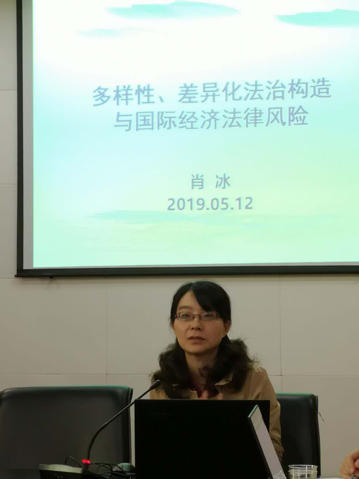 肖冰教授做了题为“多样性、差异化法治构造与国际经济法律风险”的报告。肖冰教授首先界定了法律风险、认知和防范的含义,接着对于法律的确定性提出了质疑。在此基础上,肖冰教授结合大量的国际经济案件裁判结果,并从“有法”、“找法”以及“用法”三个方面详细分析了在规范渊源、法律适用以及司法裁判方面存在的不确定性,进而得出法治的“多元化”和“差异性”特点。