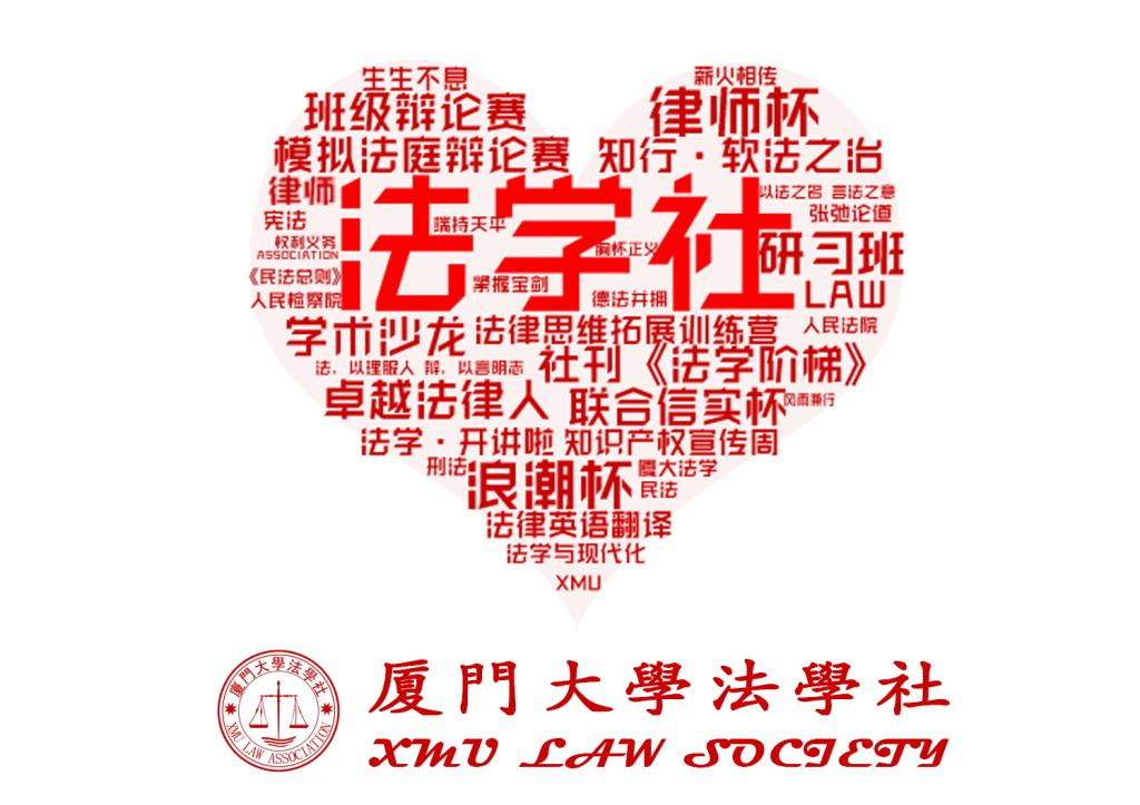厦门大学法学社成立于1984年,至今已有三十余年的光辉历史。法学社坚持以“端持天平,紧握宝剑;胸怀正义,德法并拥”为宗旨,是众多法学学习者、爱好者、研究者开展专业学习和业余科研活动的学术阵地。秉承着“丰富同学课余生活,开展法学第二课堂”的社团精神,法学社完善了专业学习和实践能力相互促进的良性循环。社团与福建省、厦门市的公检法机关建立了良好关系,鼓励学生开拓国际视野,助力于培养涉外型法律人才。