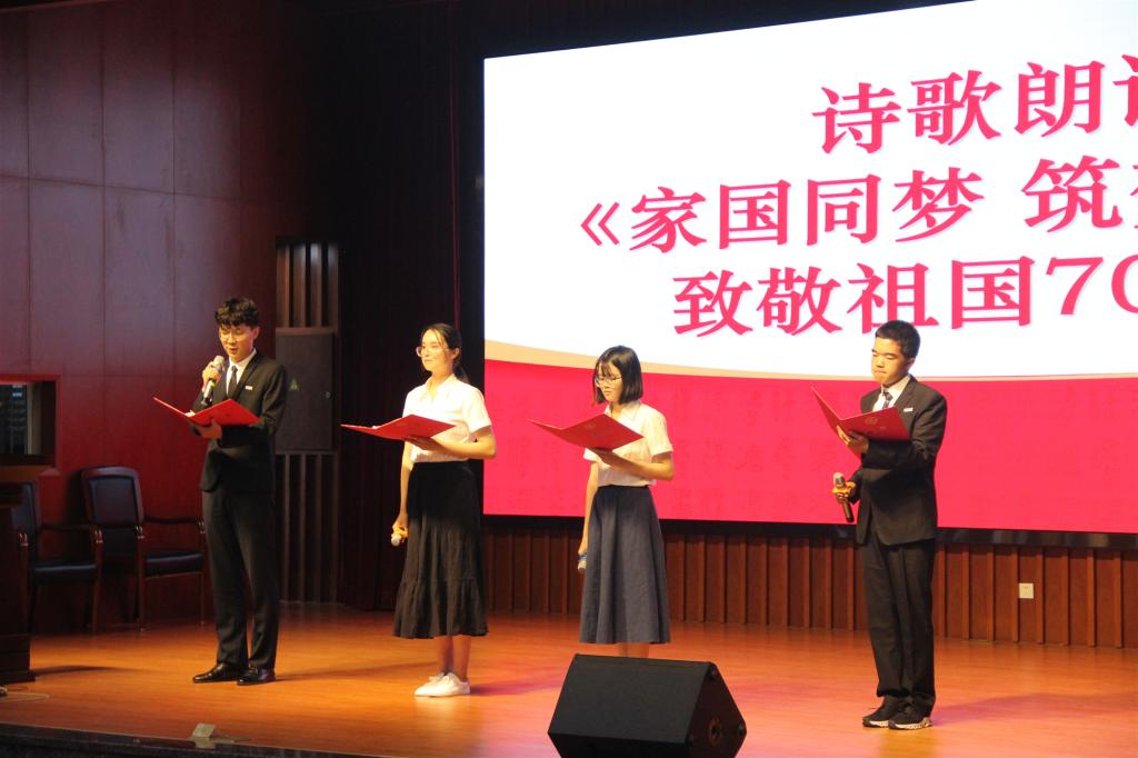 典礼上,为庆祝中华人民共和国成立70周年华诞及厦大法学93年办学历程,法学院2017级本科生杨景逸与2019级本科生赖珍、刘怡含和高琳越共同为大家带来诗朗诵《家国同梦 筑梦廌园》。他们怀揣着法治理想,以慷慨激昂的语言,将自己欲挥法律之利剑、持正义之天平,为祖国法治建设添砖加瓦的雄心壮志表达得淋漓尽致。
