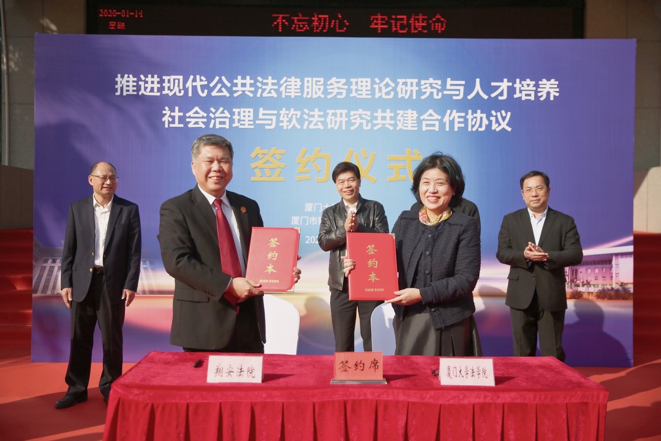 为深入推进现代公共法律服务体系建设,加强社会治理与软法研究,推动高校科研与司法实践有效对接,培养造就更多符合时代发展要求、适应法治实践需求的高质量社会主义法治人才。1月14日下午,厦门大学法学院与翔安区人民法院举行共建合作协议签约仪式,并为在翔安法院设立的“厦门大学现代公共法律服务研究实践基地”及“厦门大学社会治理与软法研究实践基地”揭牌。