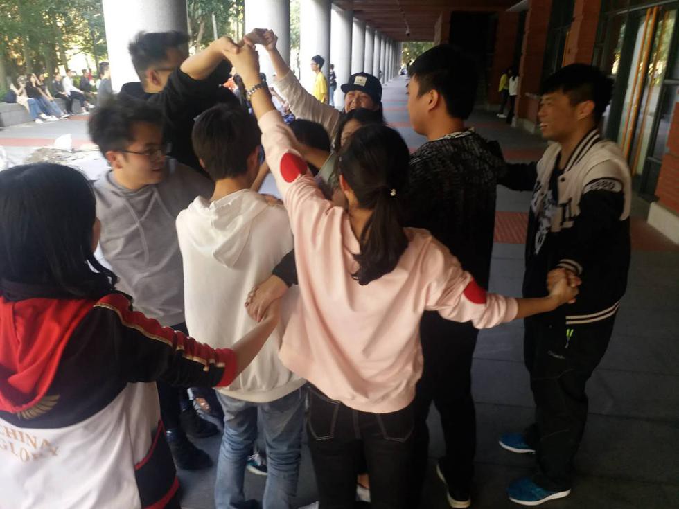 接下来是第三个游戏,叫做解手链。男生女生围成圆圈,交叉开来,搭配握手,然后想办法解开手链,整个走廊一片欢声笑语,同学们在轻松愉快的气氛中,穿梭来去,亲密的接触使得同学们之间迅速亲密了起来。