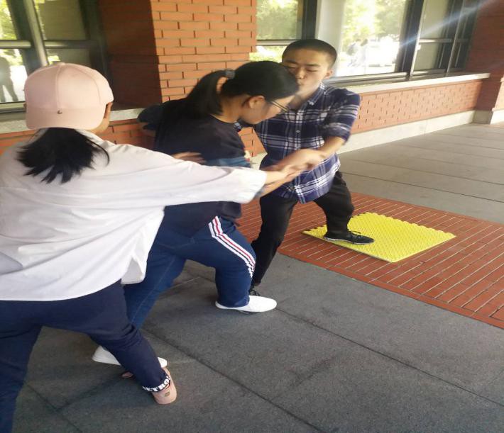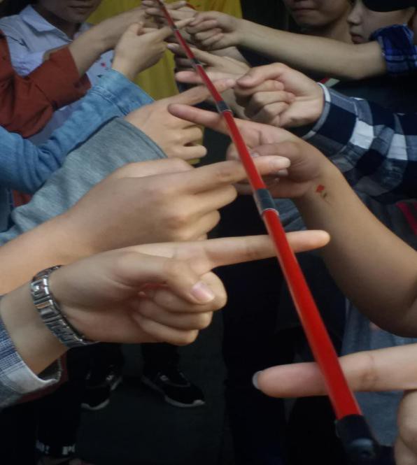 接下来进入了第二个叫做齐眉棍的游戏,在这个游戏中同学们分为了两组,分别使用两根棍子比赛完成任务:将棍子由齐眉的位置放至地上,听起来很简单的游戏却花费了很长时间,许多同学在一次次失败中不断重新开始,这正是在这个游戏中,今天参与素拓的同学们开始第一次有了协同合作的意识。