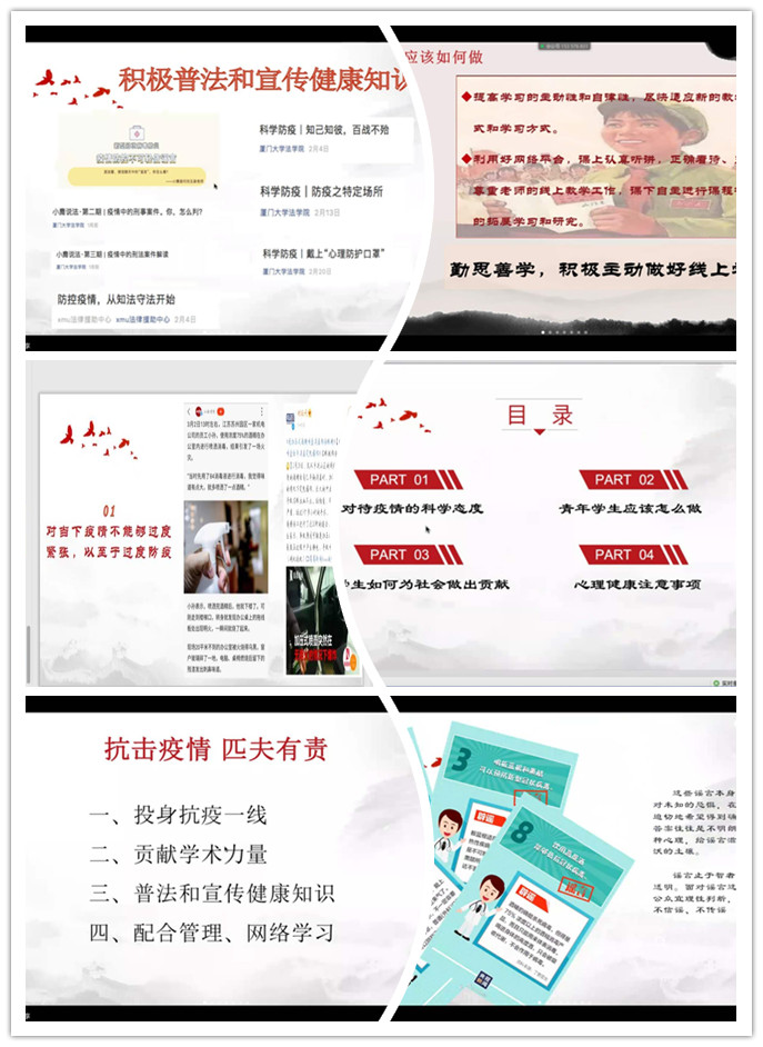 李翰钊向大家展示了厦法师生的抗击疫情画卷——许多厦法学子在疫情期间投入到了社区防疫抗疫的一线,争当青年志愿者;法学院林秀芹教授、刘连泰教授、博士生石梦婷等针对疫情中管理制度等问题积极建言献策,贡献学术力量。法援中心和法学社也针对疫情所涉及的法律事件、法律问题进行解读、普法,推出了系列推送。学院积极组织线上教学,健康打卡等活动响应国家、学校关于疫情防控、停学不停课的号召和指示。