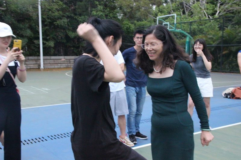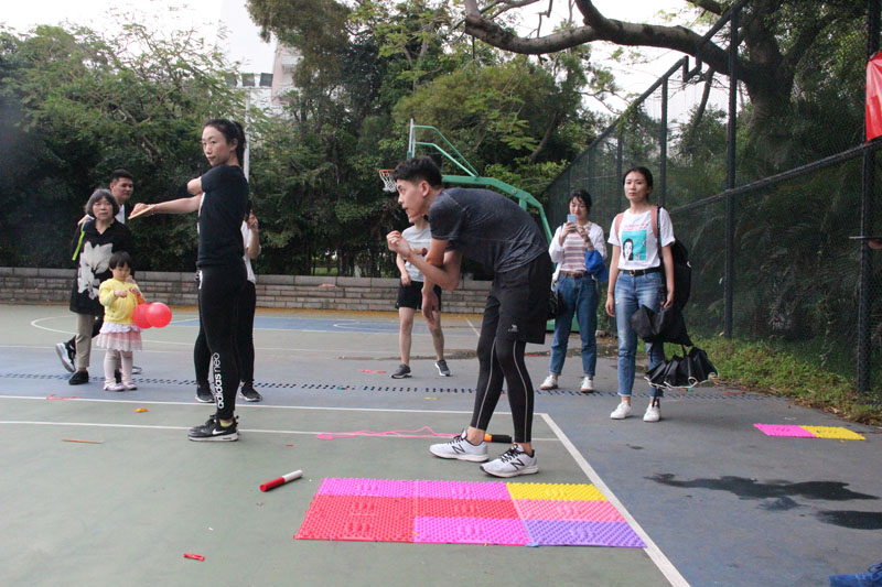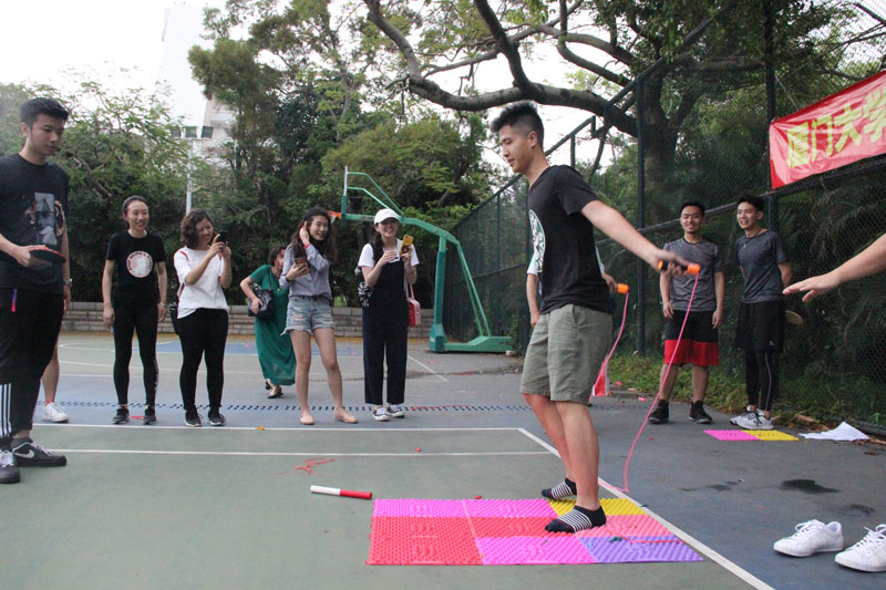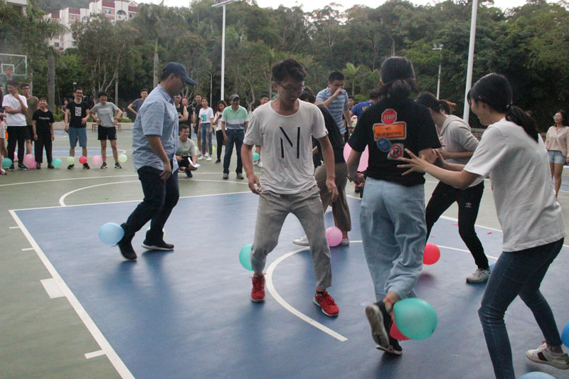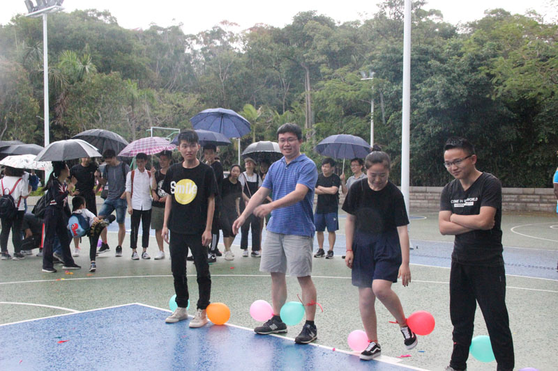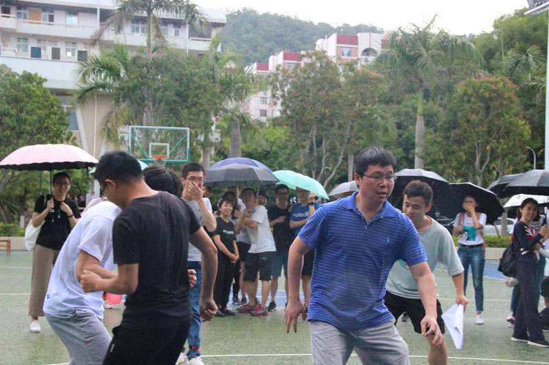 郑永宽老师也加入了踩气球的行列,与队友们一起作战,体验游戏的乐趣,虽然下着小雨,可是老师和同学们都沉浸在踩气球的游戏当中。