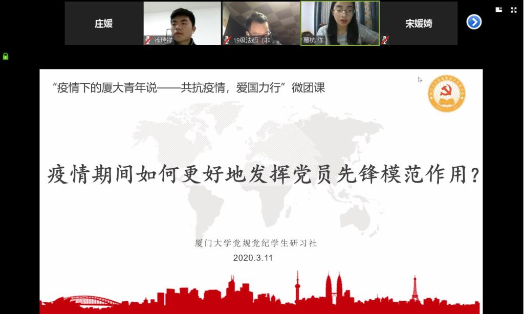 为深入学习贯彻习近平总书记有关新冠肺炎疫情防控工作的重要讲话精神,进一步激发研究生党员的责任担当意识,在研究生党员中厚植爱国主义,号召党员们主动出列、接受考验,为坚决打赢疫情防控的人民战争、总体战、阻击战贡献青春力量。在法学院团委的指导下,2020年3月11日晚,厦门大学党规党纪学生研习社团支部利用线上平台开展了廌园先锋理论学习会暨“疫情下的厦大青年说”主题微团课,内容主要围绕“疫情期间如何更好地发挥党员先锋模范作用”展开,会议由社团支部书记、社长徐瑞祥主持。