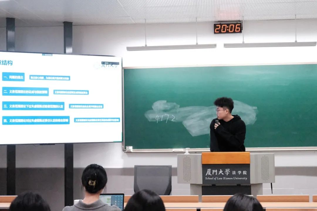 第三位主讲人饶涛盛同学赏析的论文是北京大学洪国盛博士的《义务范围理论下证券服务机构过失虚假陈述赔偿责任》。饶涛盛同学认为该论文以义务范围理论研究证券服务机构过失虚假陈述的责任承担问题,具有突出的现实意义和学术新颖性。本文按照“提出理论、证成理论、应用理论”的行文思路进行,条理清晰。在研究方法方面采用了案例分析、比较分析以及规范分析的方法,深入浅出地阐明了义务范围理论的核心观点,值得大家学习。肖老师总结道,义务范围理论的确具有一定的合理性,但是不同证券服务机构之间的职责划分问题仍需要进一步探讨。同时,他强调同学们在学术研究中一定要克服日常用语的笼统性,在论文写作时遣词造句要注意严谨,保持学术用语的精确性。