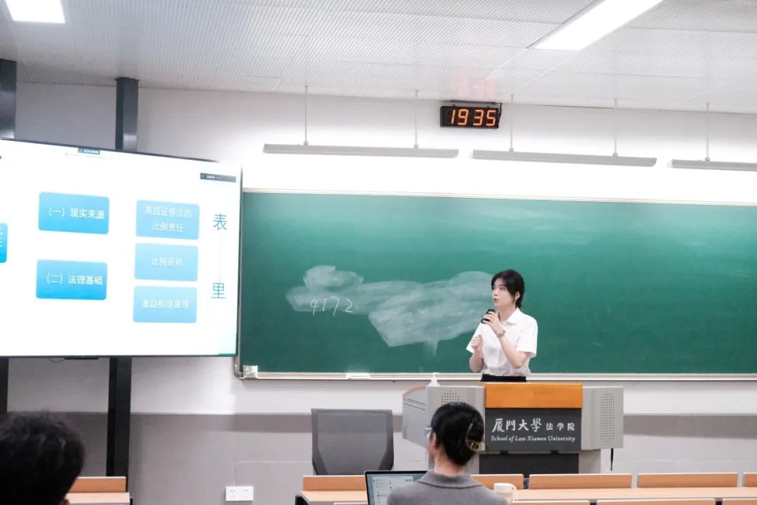 第二位发言的同学是梁津梅,她赏析了《虚假陈述比例连带责任的认定模式与体系展开》一文,作者是中国政法大学博士后邹学庚。梁津梅同学认为这篇文章有许多值得我们借鉴的地方,如这篇文章运用了丰富的研究方法,又如本篇文章行文严谨、逻辑结构严密、保持前后论证思路的一贯性等,但也存在未明确追偿比例计算思路的不足。肖老师认为考虑到主观上只有一般过失、甚至轻微过失的证券市场中介机构、公司独立董事等在虚假陈述案件中起到的作用非常有限,不应该令这些主体与“首恶”承担连带责任,考虑到其从工作中获得的受益,要求这些主体承担连带责任也属过当,可以考虑补充责任的引入,并设置相应的限额。肖伟老师同时认为这篇文章值得同学们学习的地方在于其开门见山提出问题。老师提醒同学们论文写作要有问题意识,不能为了写论文而写论文,不要“为赋新词强说愁”,要善于发现法律实践以及法律理论中存在的问题,并加以研究,提出自己的解决方案。