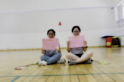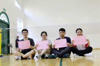 到了下午四点,本次羽毛球赛已接近了尾声。参赛选手们坐在一起愉快交流,并合影留念。