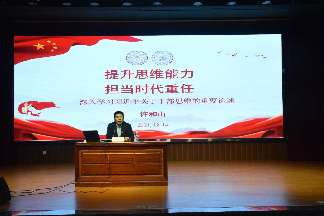12月14日,法学院在模拟法庭举办“提升思维能力,担当时代重任——深入学习习近平总书记关于干部思维能力论述”专题党课。专题党课由法学院党委主办、厦门大学党规党纪学生研习社党支部承办,法学院党委书记许和山担任主讲人。法学院党委组织员刘群鑫,辅导员、社团指导老师宋磊华和全体研究生党员参加了此次专题党课。