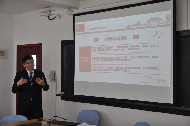 会上,34名学生党支部书记身着正装、佩戴党员徽章,结合PPT,图文并茂地进行述职。主要从履行党建第一责任人情况、党支部建设进展情况和成效、思想政治工作开展情况、存在问题及整改措施等方面进行了汇报。在这个过程中大家也相互学习和交流支部建设的经验,分享有意义的创新型党建活动。