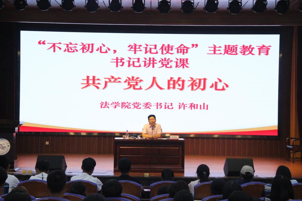 在新中国70周年华诞来临之际,2019年9月29日下午,法学院党委组织开展了“不忘初心、牢记使命”主题教育之书记讲党课,法学院党委书记许和山在模拟法庭为2019级本科新生讲述了“共产党人的初心”,活动由法学院党委副书记张伟主持。