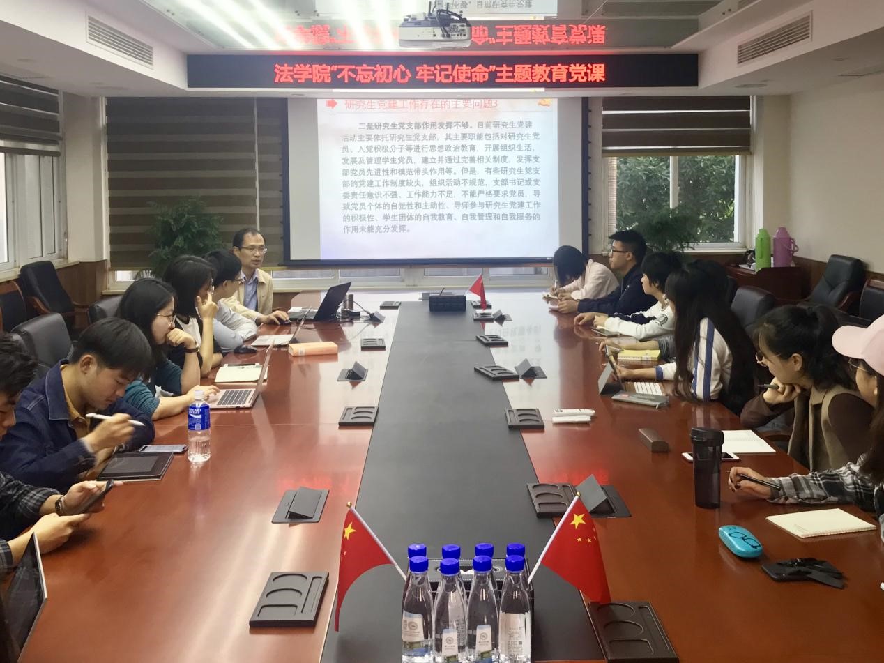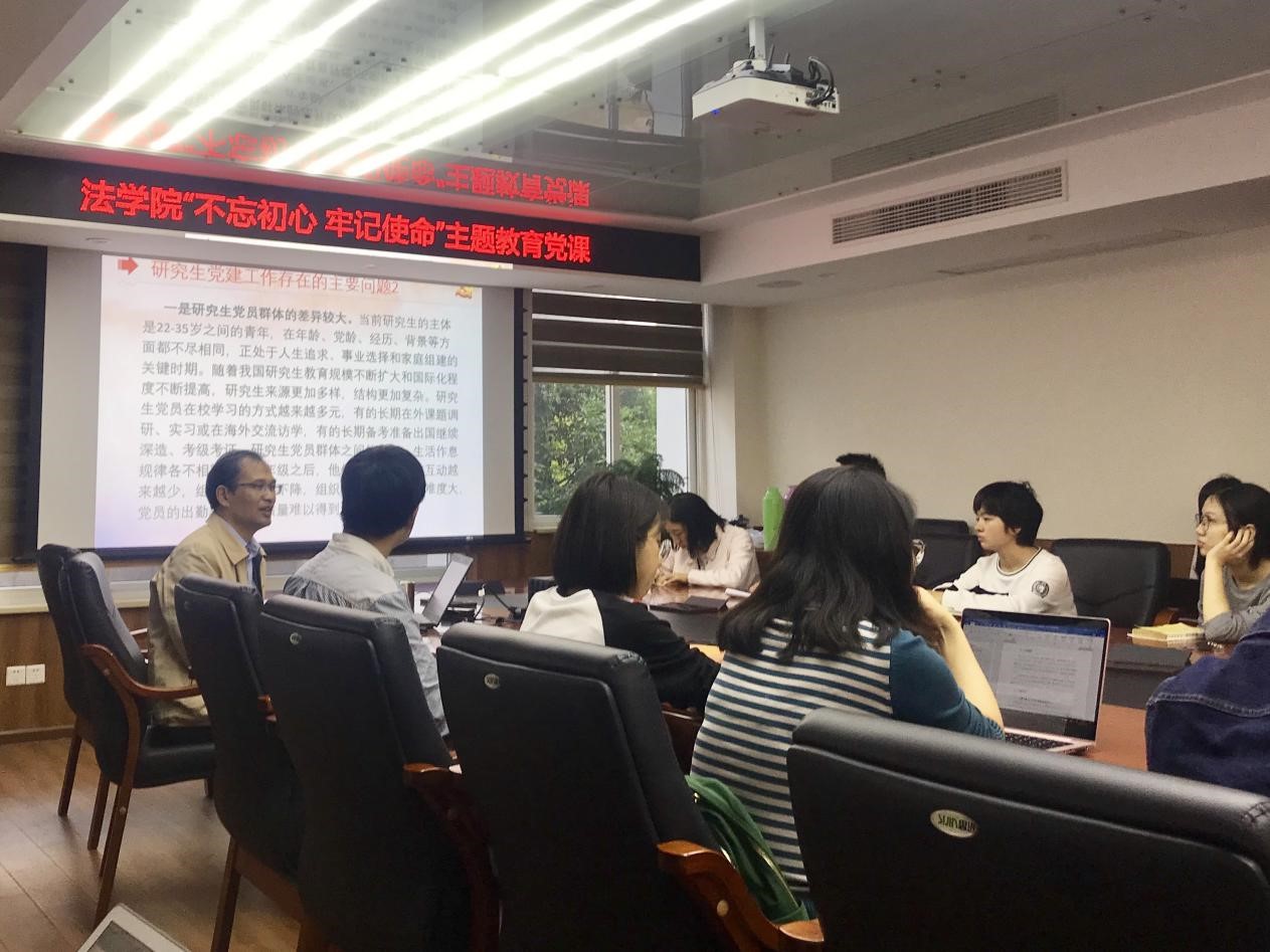 11月18日下午,法学院举行了“不忘初心、牢记使命”主题教育党课之2019级研究生党员骨干培训会,法学院党委副书记郭锦星老师为2019级研究生党员骨干上了一堂以“提升研究生党建工作质量,培养担当民族复兴大任的时代新人”为主题的党课,总结了入学以来新生党建的工作情况,并结合当前研究生党建形势,开展研究生党建工作专题培训。