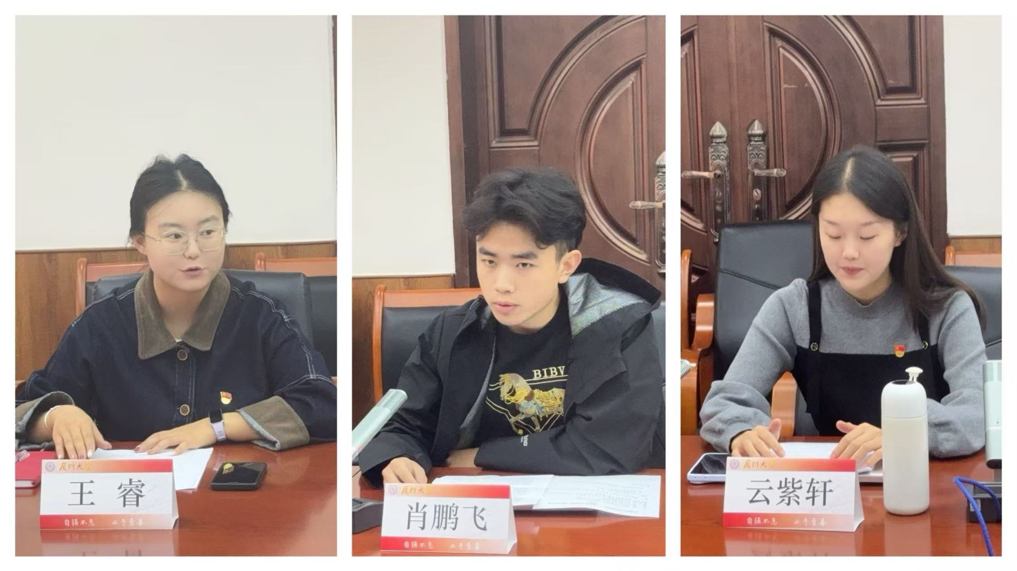 在交流环节,学生代表结合自身学习工作实际分享心得体会。2022级本科生王睿围绕“全面依法治国”,表示将立足专业深耕学业,积极参与法律援助、普法志愿服务,做社会主义法治的忠实崇尚者、自觉遵守者、坚定捍卫者;2024级硕士生肖鹏飞聚焦“激发全民族文化创新创造活力”, 谈到要把论文写在祖国大地上;2025级硕士生云紫轩立足学生党员身份,表示要筑牢信仰之基、精进专业之能、勇担时代之责,让青春在为中国式现代化建设的挺膺担当中绽放绚丽之花。
