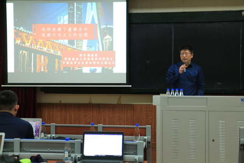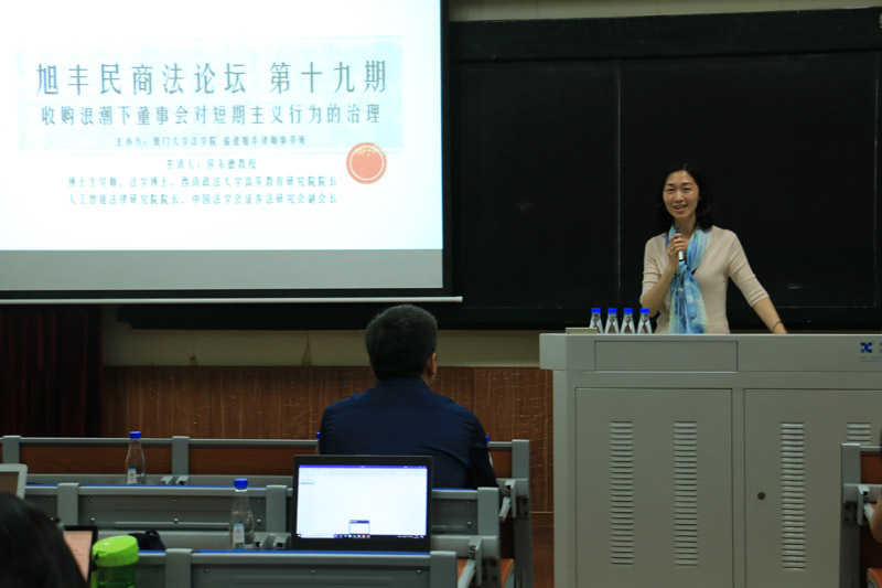2019年5月11日晚19:00,由厦门大学法学院与福建旭丰律师事务所联合主办的第十九期旭丰民商法论坛在法学院A302举行。此次讲座由我院王兰副教授主持,西南政法大学侯东德教授主讲,我院刘永光副教授、郑永宽副教授、魏磊杰副教授、郑晓剑副教授出席此次讲座。侯东德教授是西南政法大学博士生导师、法学博士、高等教育研究院院长,同时也是人工智能法律研究院院长、中国法学会证券法研究会副会长,治学成果丰富,此次应邀赴我校讲学,以“收购浪潮下董事会对短期主义行为的治理”为题,与我院学子进行了深入的交流与探讨。