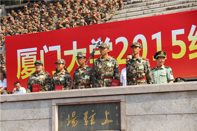 9月11日上午八点半,在上弦场举行了厦门大学2015届本科生军训结业典礼。首先,由军训总指挥官宣布结业典礼开始,全体起立奏唱国歌。接下来,队列方阵整装待发,迎军旗,并接受校党委书记张彦与部队领导的检阅。
