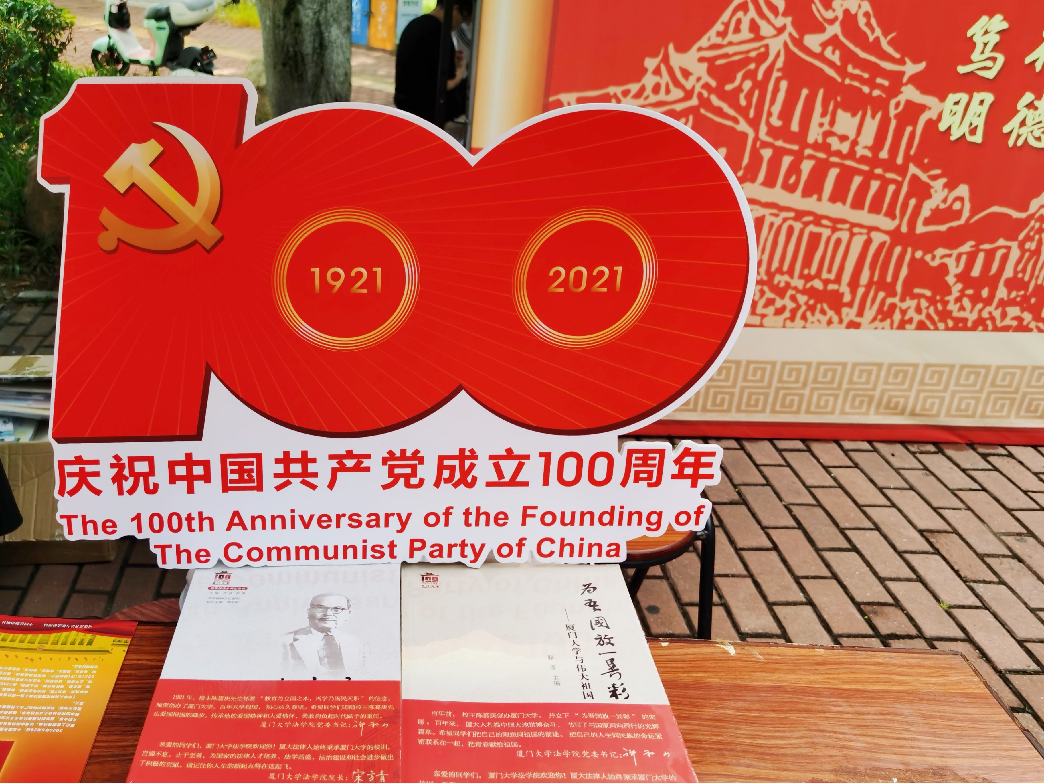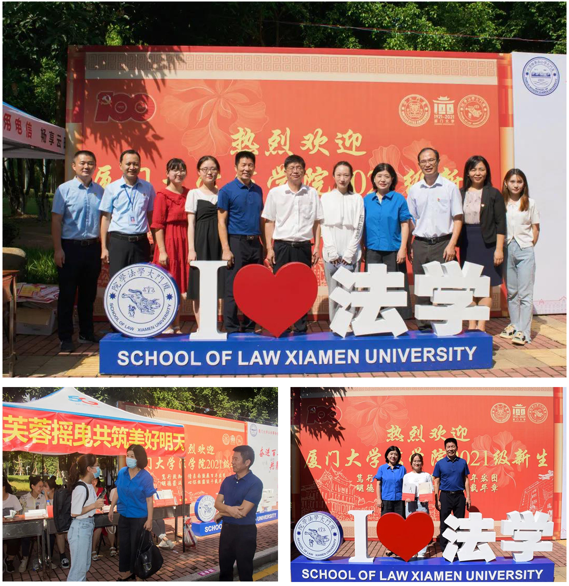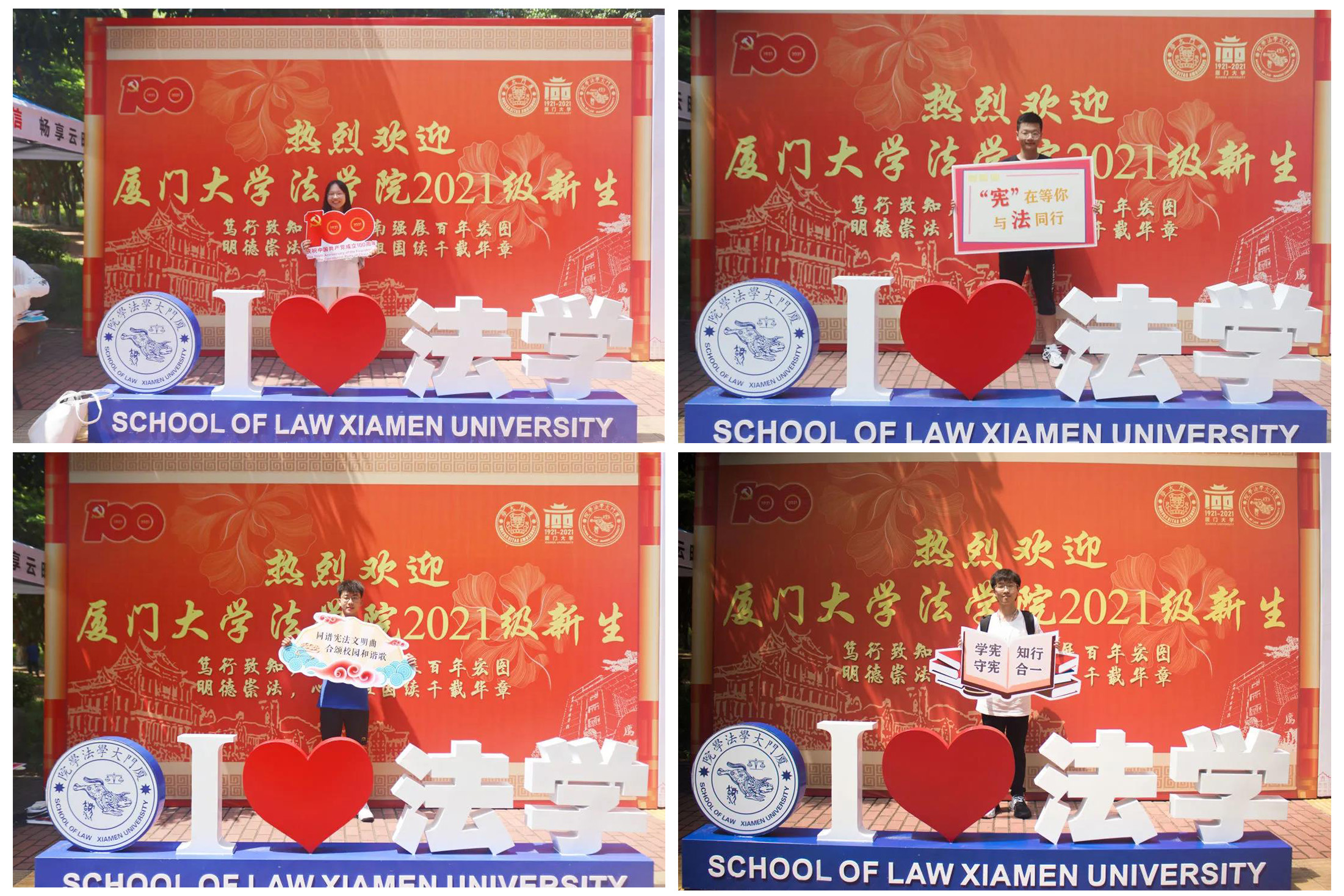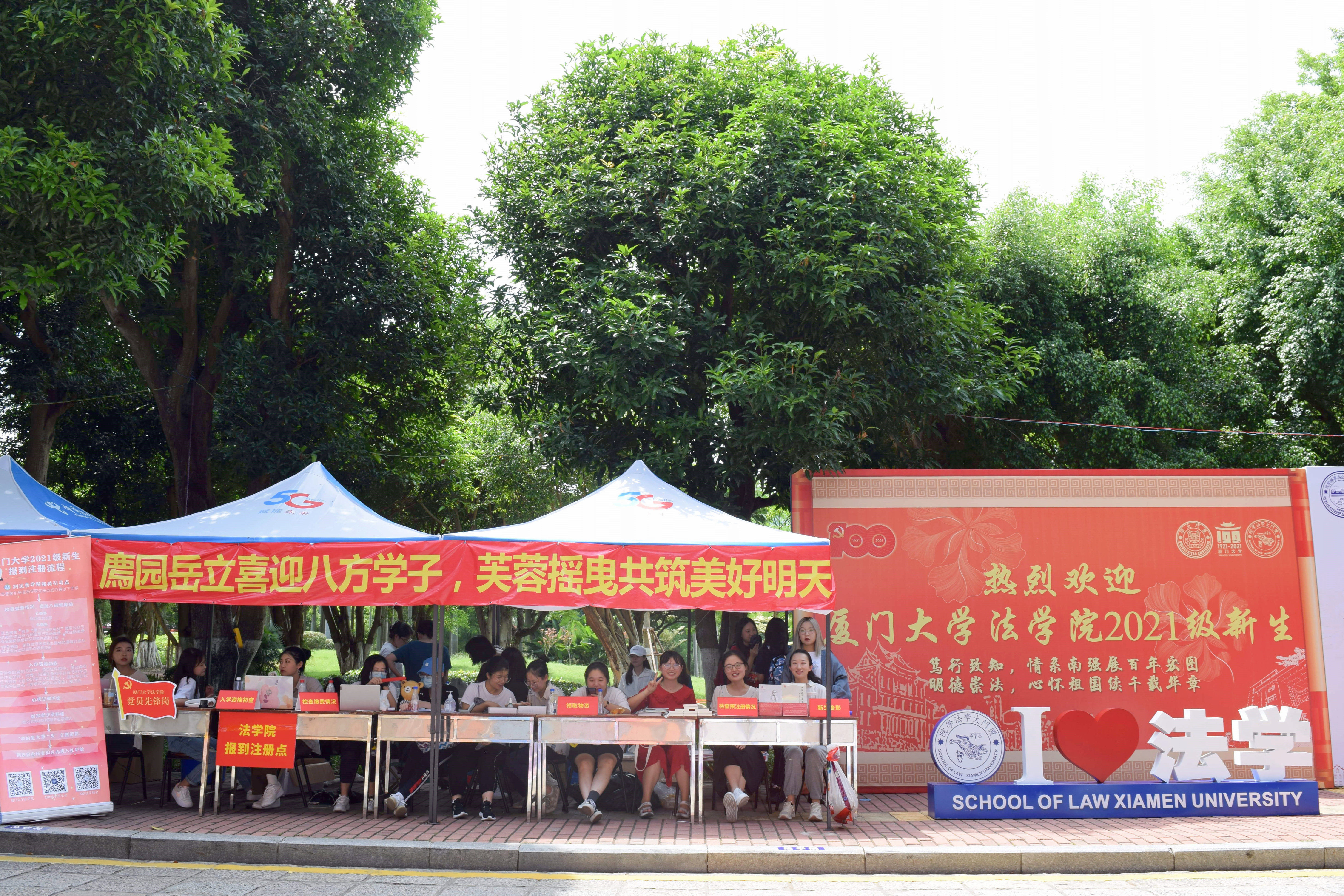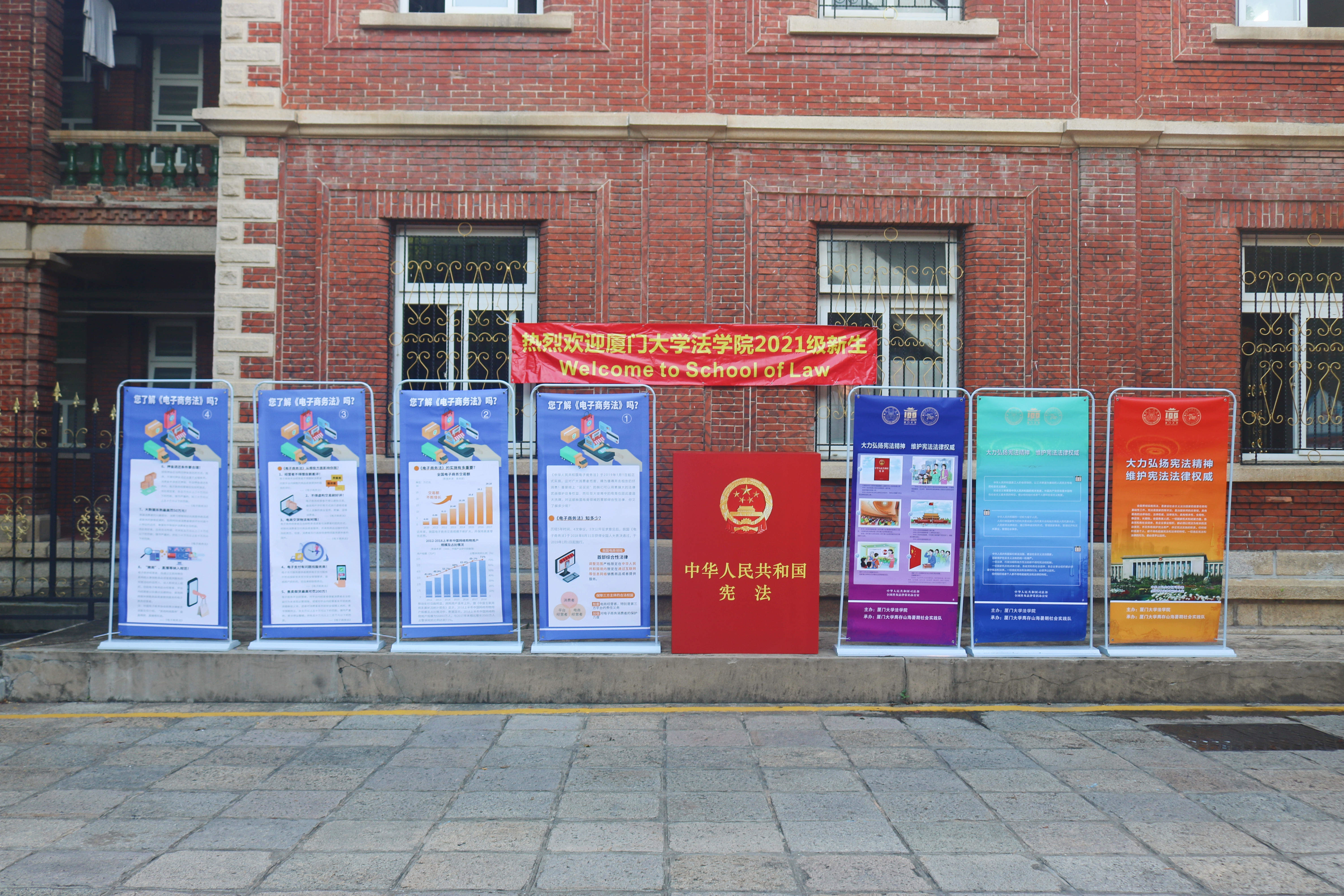 与1921年相隔世纪,又一批青年学子即将在学校、学院的荫庇下度过成长求学、遨游“法”海的四年难忘时光。为在新百年之际向新生传递法治精神、展现宪法与法律的魅力,法学院在迎新注册点开展了宪法宣传主题活动。新生手持“庆祝建党百年”“弘扬宪法精神”等标语,在迎新展板前进行“我的厦大第一天”主题留影,意在勉励自我勤学修德,做志存高远、心怀家国的法律人。注册点对面设有亮丽的《中华人民共和国宪法》立体书及主题展,用简明清晰的方式为新生带来形象生动的“法学第一课”。