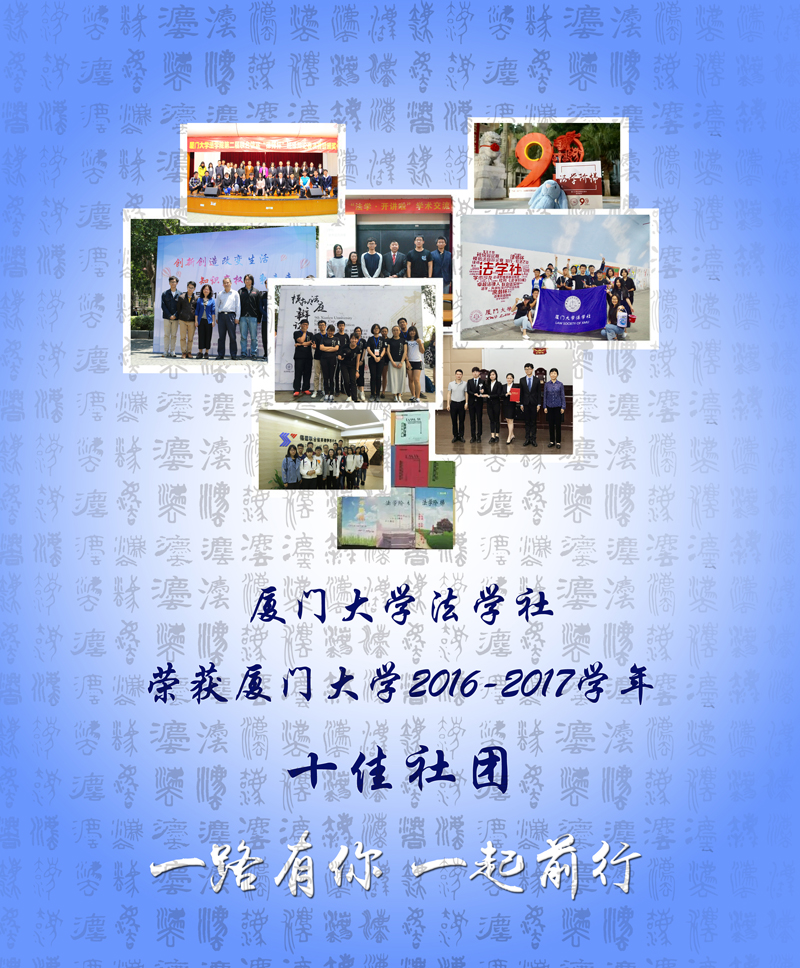凭借着过去一年中社团成员的辛苦付出与良好的活动成效,以及在网络投票、现场展示等评选环节中的优异表现,我院院属社团——厦门大学法学社在全校65个学生社团中脱颖而出,被评为厦门大学2016-2017学年“十佳社团”。社团指导老师、我院团委副书记林旭荣被评为“优秀社团指导教师”。