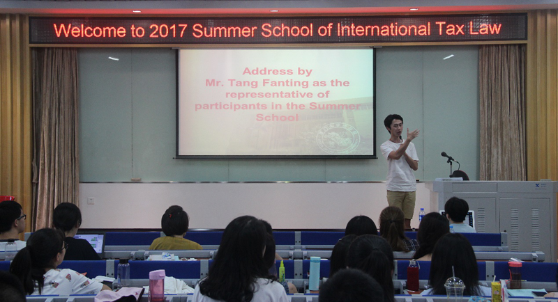 学员代表唐凡霆同学在发言中表示,他在短暂而又充实的暑期班里既收获了丰富的知识,也收获了真诚的友谊,更是爱上了厦门这座美丽的海滨城市。他一一感谢了每一位老师的精彩授课和耐心讲解,也感谢厦门大学法学院以及国际税法与比较税制研究中心为学员们提供了良好的交流学习机会。
