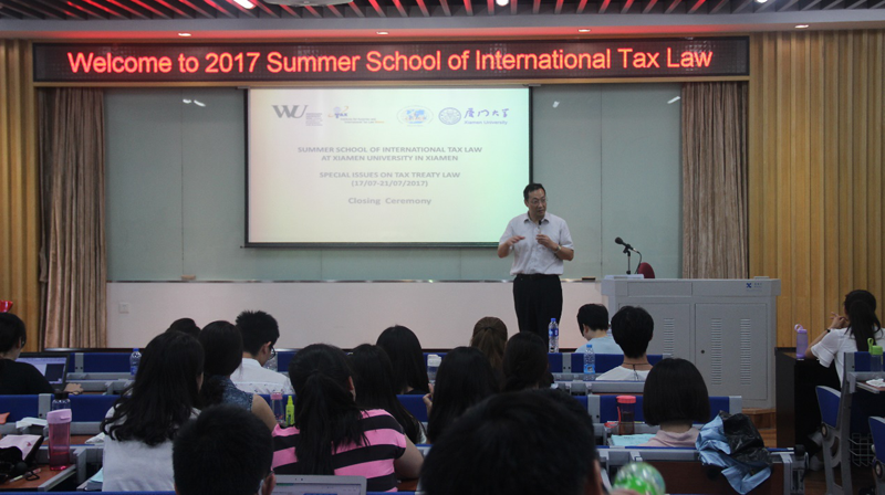 7月21日下午,2017年厦门大学国际税法全国暑期班的授课顺利完成,在令人既紧张又兴奋的结业考试之后,是轻松愉快的暑期班闭幕式。闭幕式由法学院副院长、CITACT-XMU副主任朱炎生教授主持,授课老师Mr. David Orzechowski和Mr. Sriram Govind以及暑期班学员代表唐凡霆同学分别在闭幕式上致辞。在闭幕式上,朱炎生老师表达了对教学团队的感谢以及对所有暑期班学员完满完成学习的祝贺,并感谢各界对厦门大学国际税法全国暑期班给予持续的支持。他祝愿国际税法暑期班越办越好,鼓励学员们继续保持学习国际税法的热情。