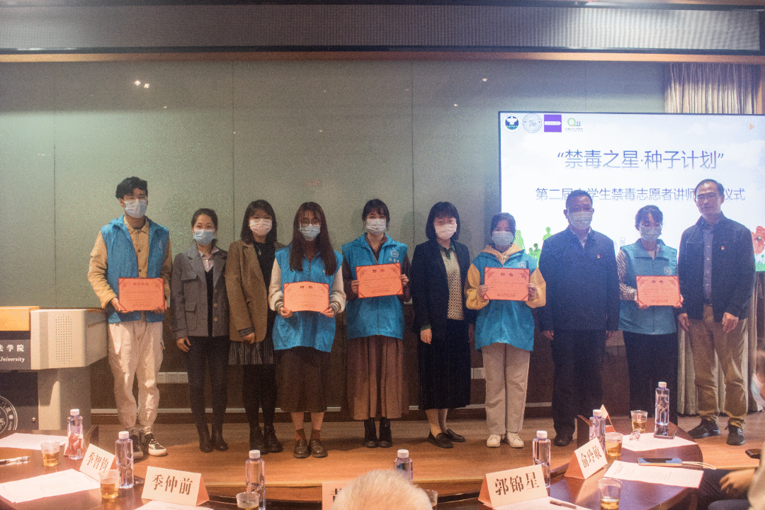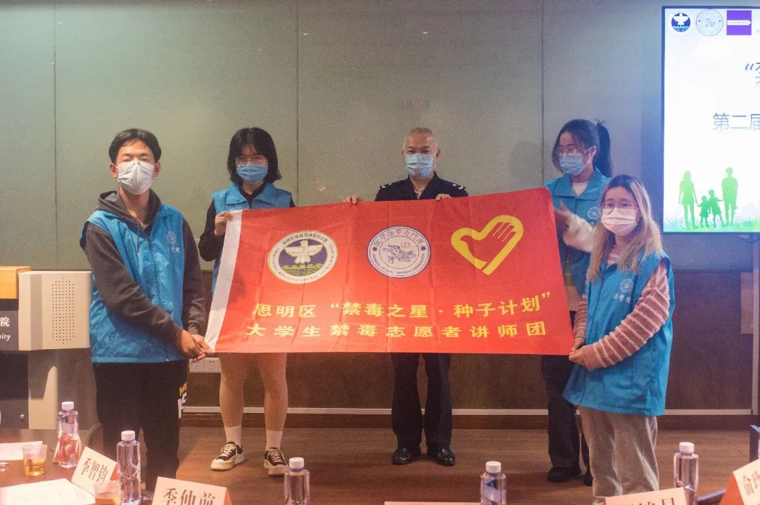 伴随着庄严隆重的音乐,第二届大学生禁毒志愿者讲师团正式成立,思明区禁毒办专职副主任黄刚毅为讲师团授旗。滨海街道二级调研员季仲前、厦门大学法学院党委副书记郭锦星、厦门大学依法治校工作办公室秘书李晴芳、共青团厦门大学委员会组织部主任王心君、厦门大学保卫部(处)治安科秘书陈雪洁为大学生禁毒志愿者讲师颁发受聘证书。