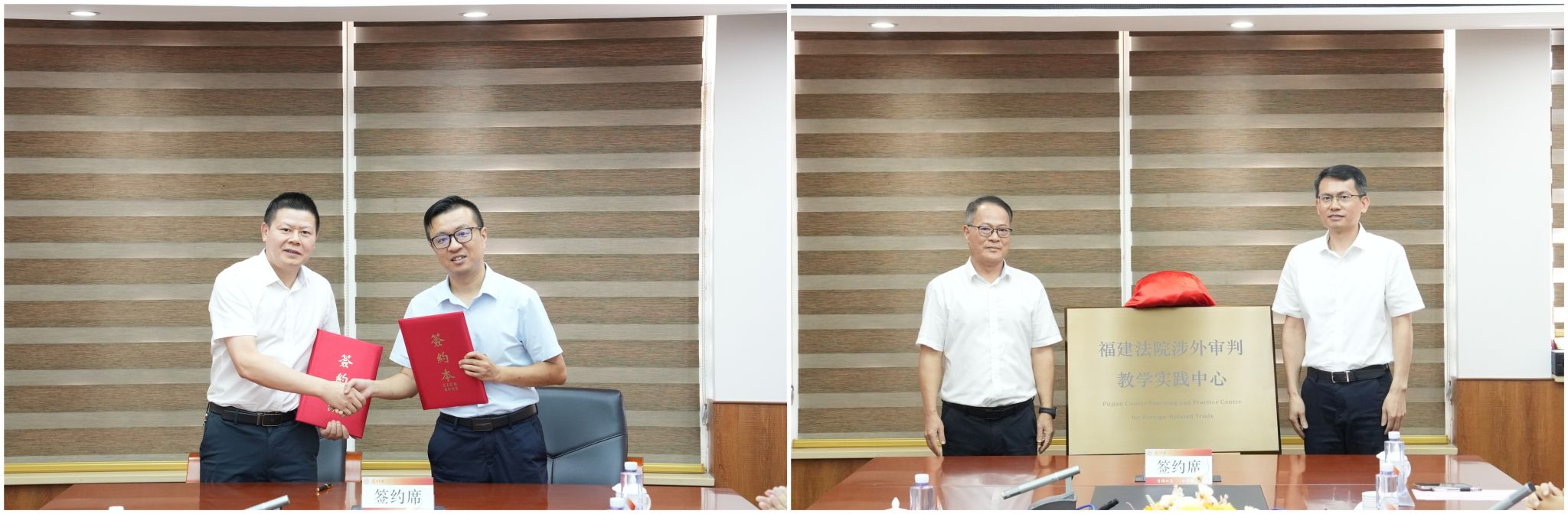 仪式上,黄庭岗与陈鹏代表双方共同签署了合作协议。随后,吴元祥与黄身勇共同为“福建法院涉外审判教学实践中心”揭牌,标志着这一开创性平台的正式成立。