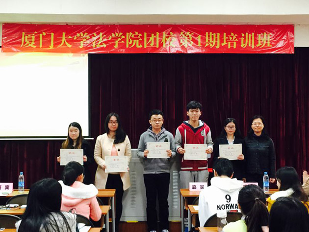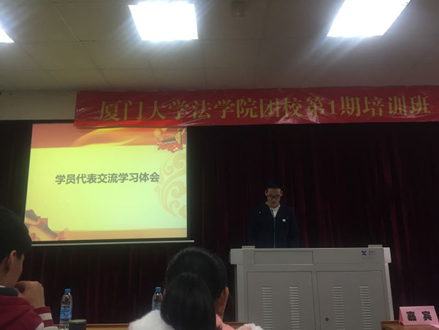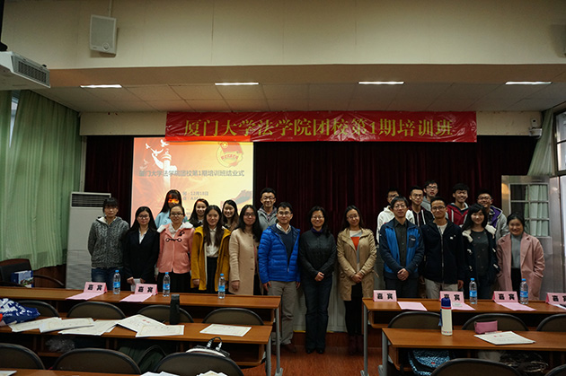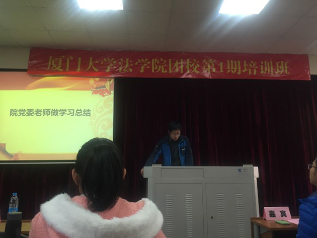 12月18日17时,厦门大学法学院团校第一期培训班结业仪式在a302教室召开,法学院党委副书记周蕾、团委书记高斌、团委副书记林旭荣、研究生辅导员宋磊华、兼职辅导员林涛以及所有团校成员参加了此次结业仪式,本次结业仪式由本科生林卉卉主持。