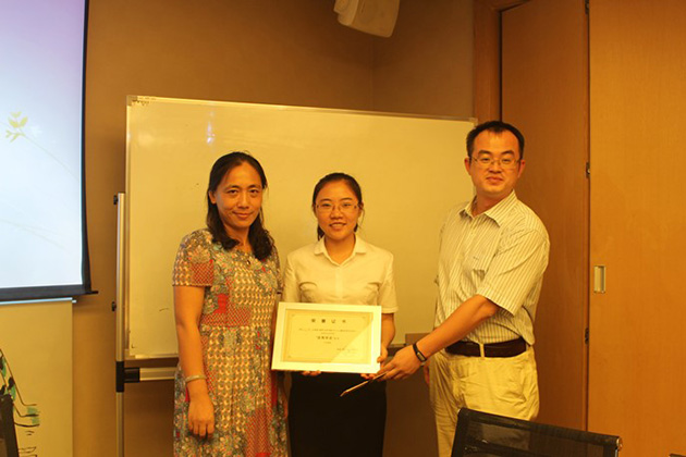 (刘学敏和吴旭阳副教授为优秀学员叶远燕颁发奖状)