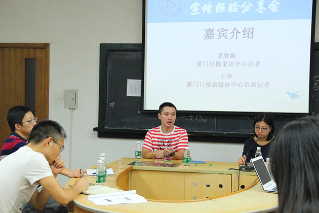 2016年7月18日晚,法学院院庆宣传工作经验交流分享会于法学院B520举行。会议由法学院团委书记高斌主持。厦门日报新媒体中心首席记者王望与厦门日报采访中心记者谭欣妮到现场与院庆宣传组的同学们交流了许多非常宝贵的宣传经验。法学院实验室、网络管理负责人胡方舟老师、宣传中心负责人陈晓忆、研究生会网宣部部长张玲萍、学生会宣传部部长蔡晨昕以及院庆宣传组的其他工作人员也参与了本次交流活动。