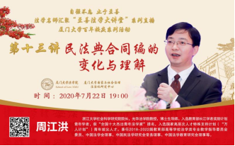 2020年7月22日晚,厦门大学“至善法学大讲堂”第十三讲——“民法典合同编的变化与理解”通过网络平台顺利举办,此次讲座由教育部长江青年学者,中国法学会理事,中国民法学研究会常务理事,浙江大学社会科学研究院院长,光华法学院周江洪教授主讲,由厦门大学法学院副院长郑晓剑副教授主持。