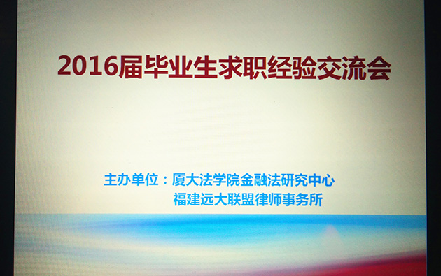 2016年6月19日下午2点,由厦门大学法学院金融法研究中心和福建远大联盟律师事务所联合举办的厦门大学“远大”金融法高端论坛系列讲座之“2016届毕业生求职经验交流会”在我院B520教室如期举行。金融法中心的庄哲学长、周伟峰学长、李逸斯学长、饶攀学长、曹杨学姐、黄婧学姐、马晓彬学长、那续怀学长和杨毅学长依次分享了他们在过去一年里的求职经验和心路历程。