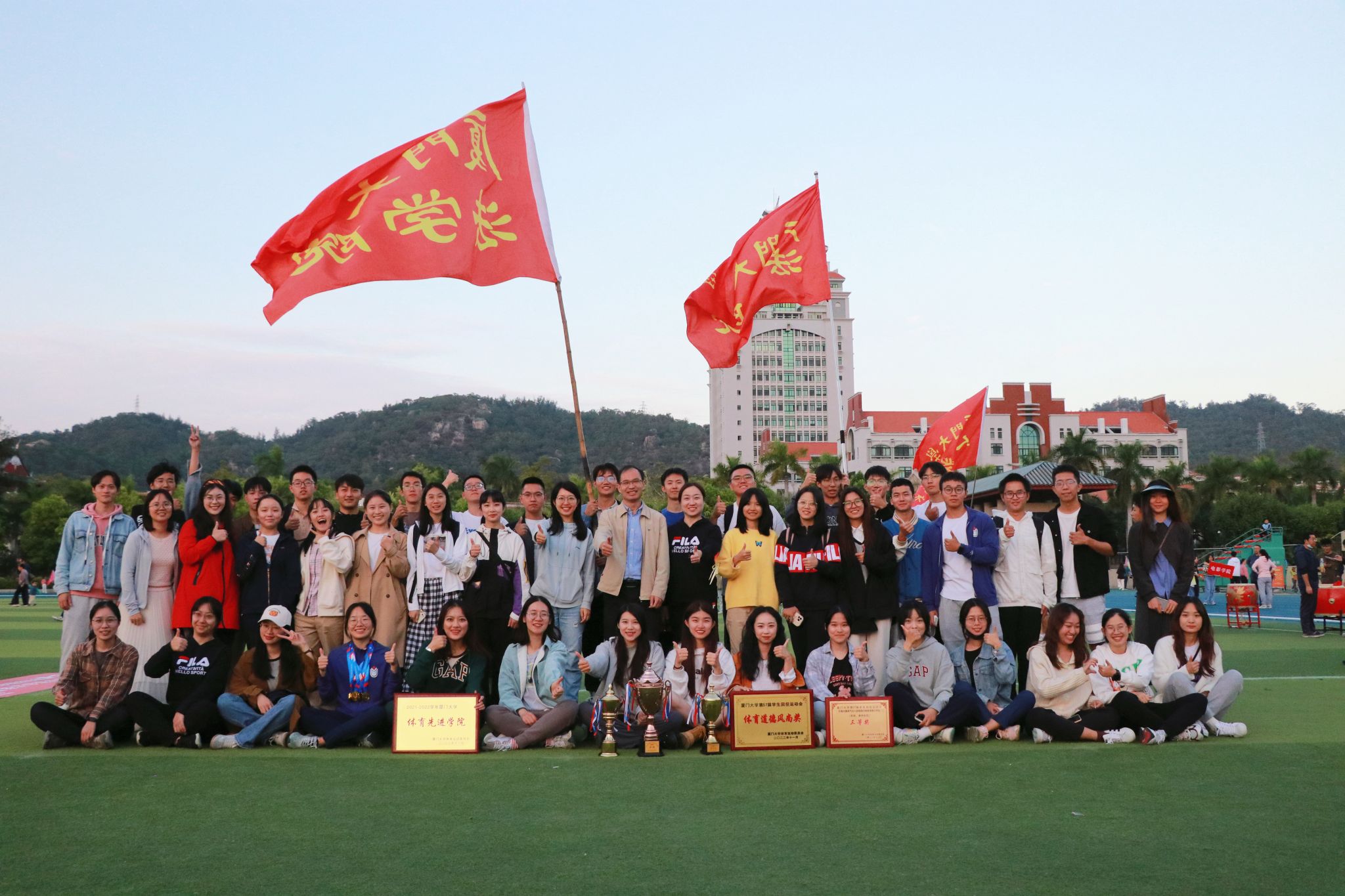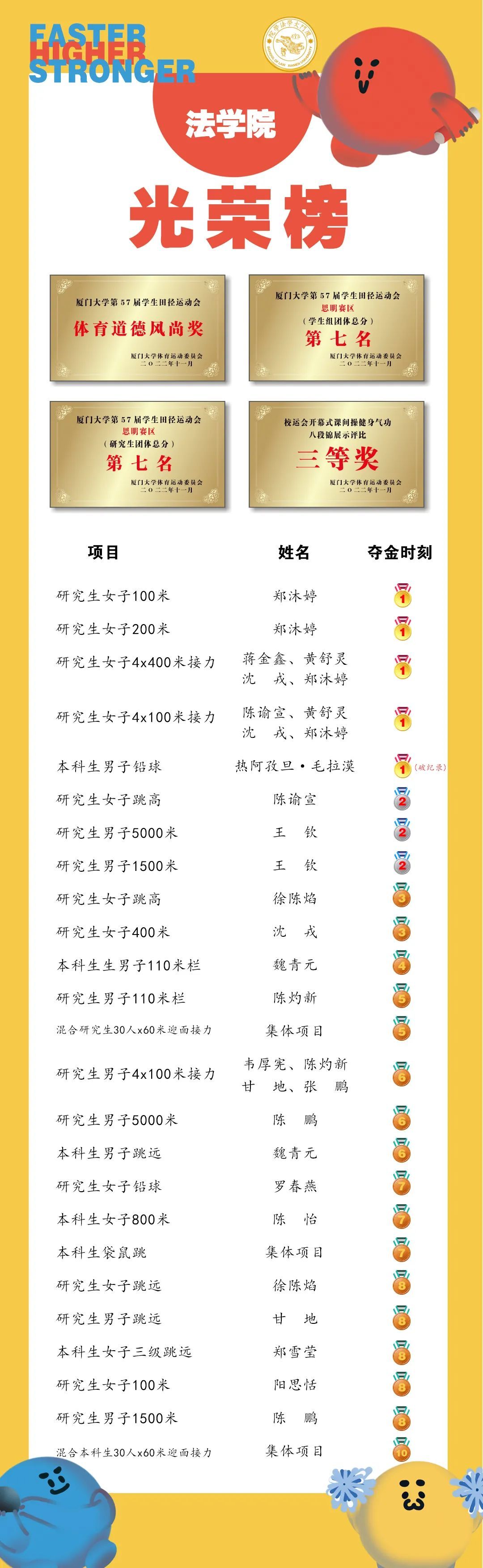 在两天紧锣密鼓的赛程里,法学院的运动健儿们意气风发、顽强拼搏、挥洒热血;工作人员和志愿者全力保障,呐喊加油,让青春的活力与热情飞扬在运动场的上空。最终,法学院荣获思明校区团体总分第七名、研究生组总分第七名、八段锦健身气功三等奖,同时荣获体育道德风尚奖!