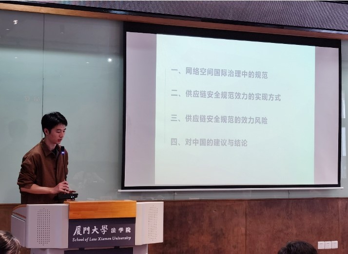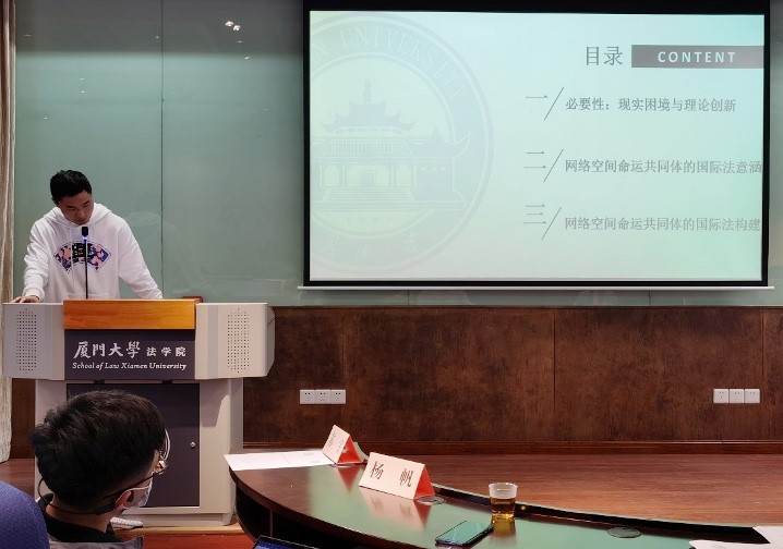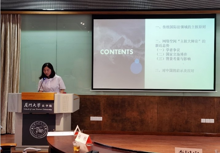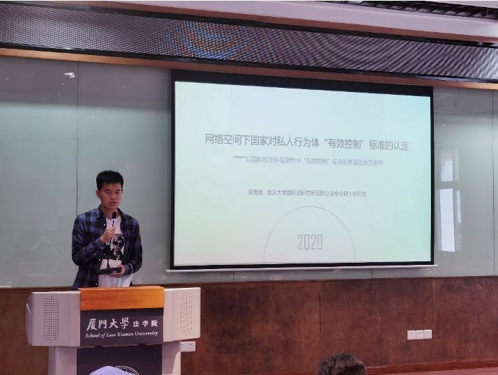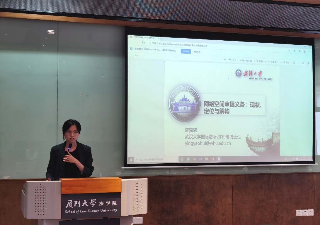第二阶段,武汉大学博士研究生陈徽介绍了信息通信技术供应链安全领域的国际法规范及其效力实现方式、效力风险等,提出我国在应对供应链安全规范效力时可采取的策略。武汉大学博士研究生应瑶慧以“网络空间审慎义务:现状、定位与解构”为题进行发言。她从初级规则与次级规则的特殊视角厘清网络空间审慎义务的内涵,并结合联合国信息安全专家组的共识报告对该义务展开解构分析,以期展望网络空间审慎义务的研究前景。武汉大学硕士研究生梁蕾庭则以传统国际法下“有效控制”标准的形成与困境为基础,探讨网络空间中“有效控制”标准的认定,同时参照国际投资仲裁实践针对该标准的衡量因素,为网络空间国际法层面“有效控制”标准的完善提供建议。