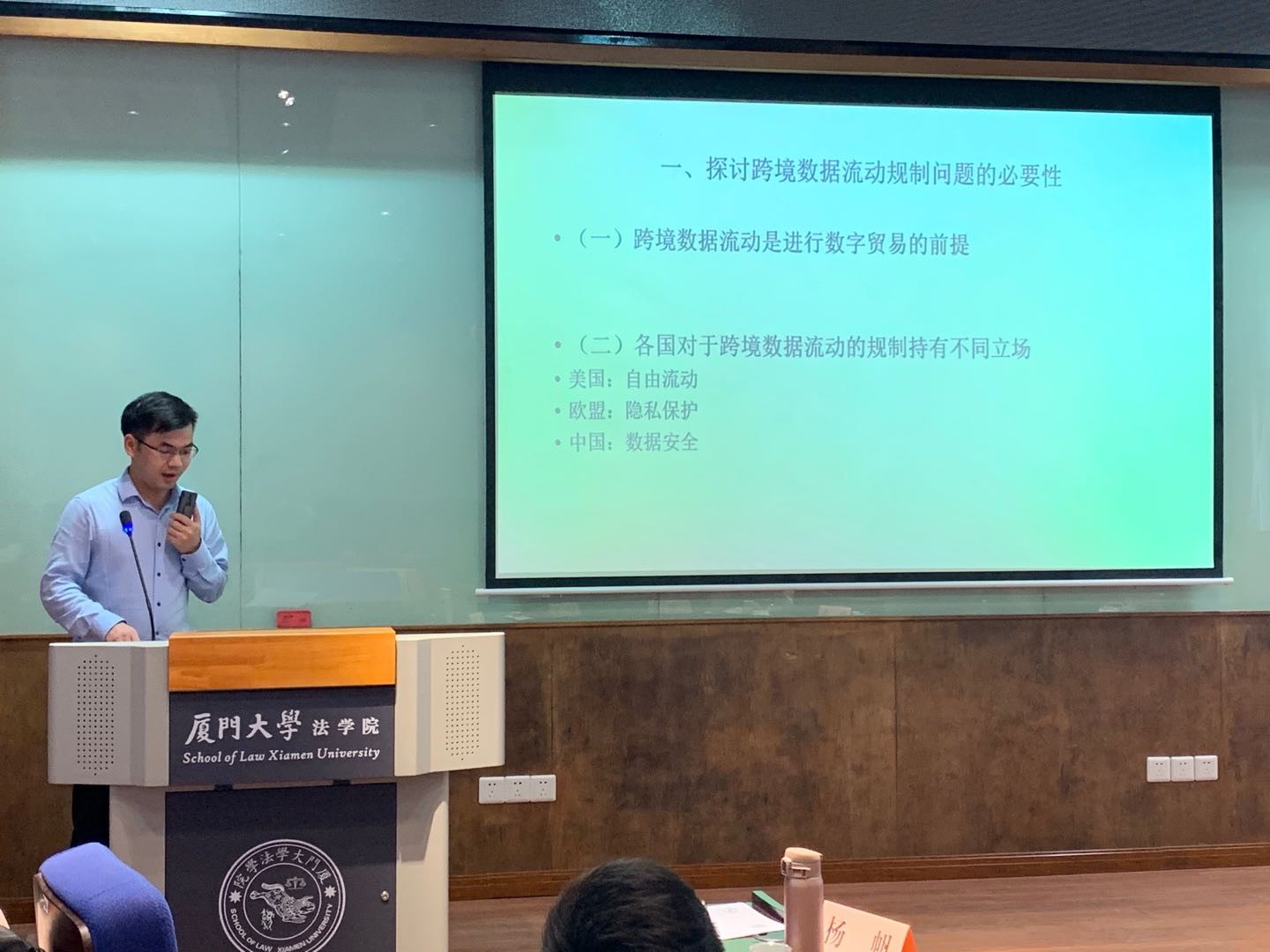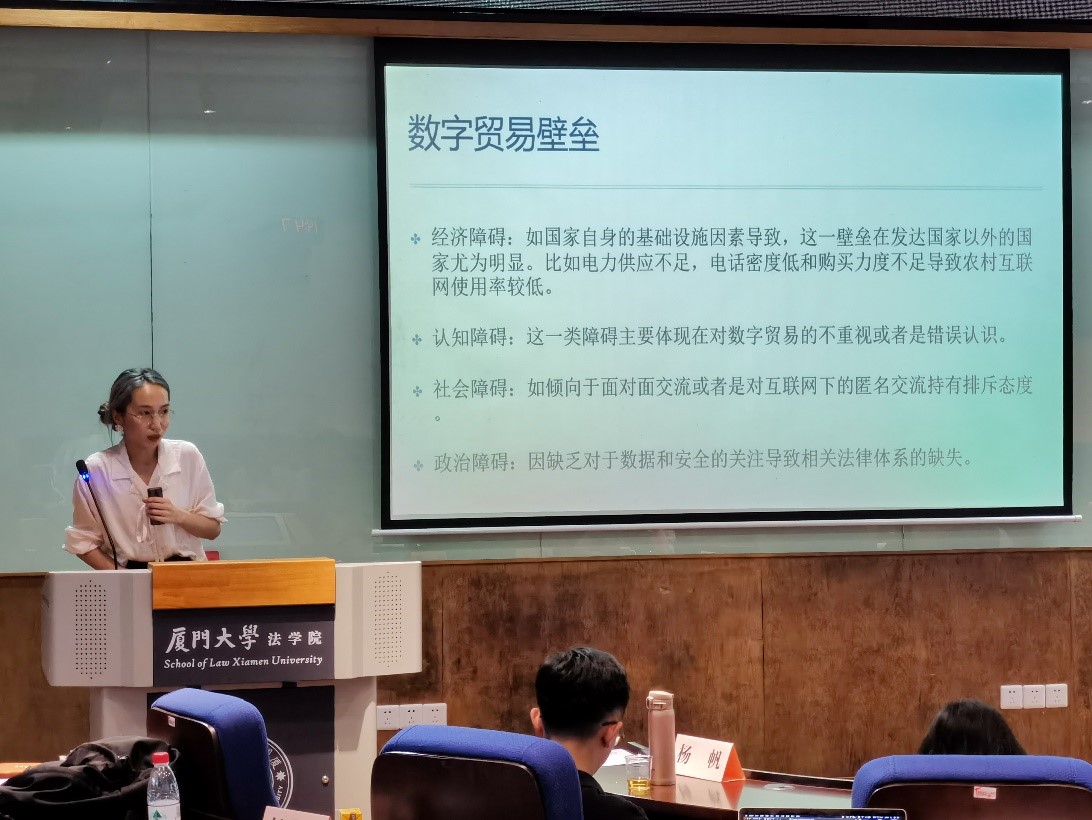 本单元伊始,福州大学硕士研究生陈琳从国内外背景、具体表现、产生缘由等方面对电子数据域外取证的法律冲突展开分析,并为冲突的协调提出相应建议。华南师范大学硕士研究生张兴和则以国际网络犯罪行为的表现、特征及立法现状为基础,指出既有监管立法困境,并分析国际网络犯罪治理的后期发展走向。中国社会科学院国际法研究所谭观福助理研究员的发言题目为“数字贸易中的跨境数据流动规制”。他首先探讨了跨境数据流动规制的必要性,其次介绍了跨境数据流动以“原则+例外”为总体要求、以特殊数据专门规则为细致规定的规制模式,最后对现阶段跨境数据流动的规则协调进行总结。复旦大学博士研究生李依琳在厘清数字贸易与电子商务二者区别以及数字贸易壁垒概念的前提下,指出WTO法律框架下数字贸易规制的不足,并提出完善WTO框架内电子商务规制的具体设想。