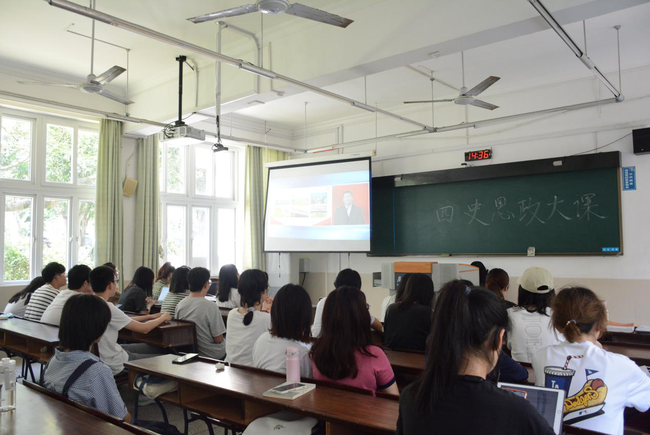 学史爱党,学史爱国,知史明智,用史力行。为深入贯彻落实习近平总书记关于深化思想政治理论课改革创新和“大思政课”的重要指示批示精神,全面落实习近平总书记在党史学习教育动员大会上的重要讲话精神,5月15日下午,法学院全体学生共同收看了“同上‘四史’思政大课”系列的第三堂课——“同上改革开放史思政大课”。在座学生聚精会神,深深沉浸在这场精神盛宴中。