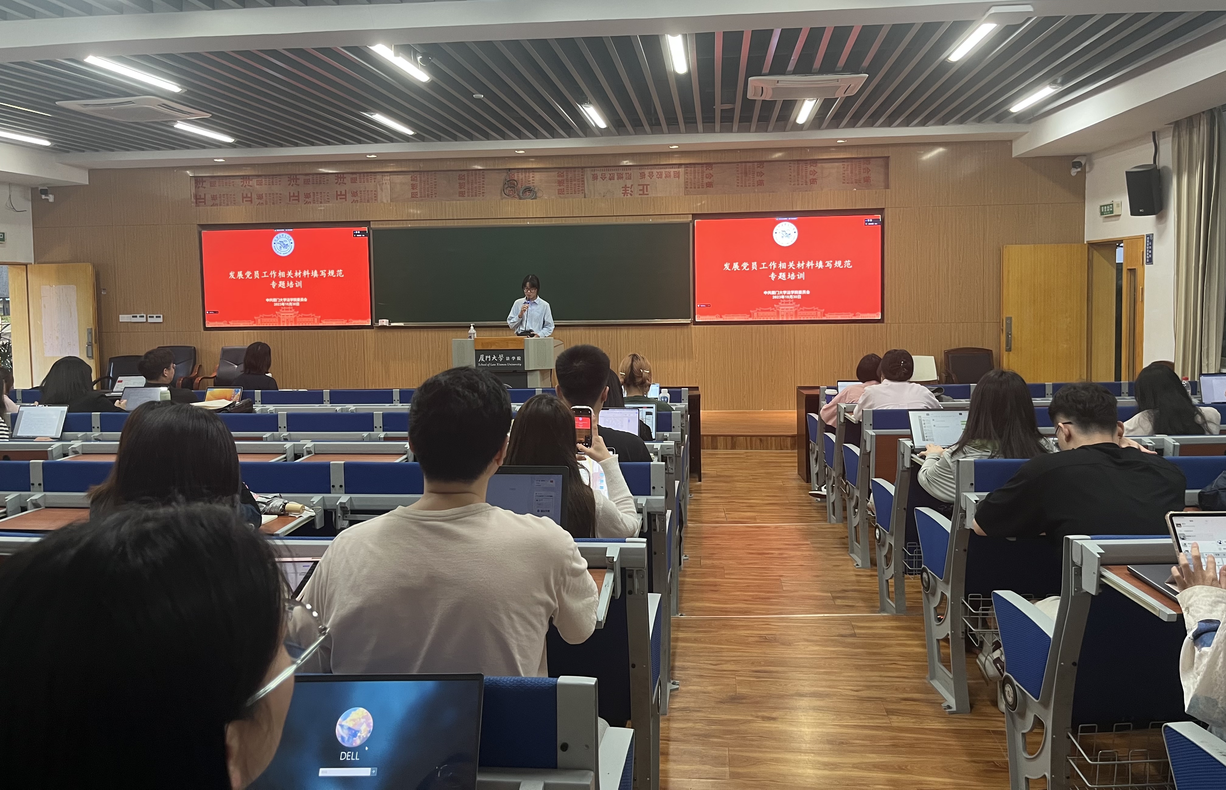 兼职辅导员王金钿作党员发展与转正相关工作说明,为参加会议的党支部书记、委员和发展、转正对象详细解读了工作流程、材料填报标准及其它重要注意事项,为各支部开展党员发展工作提供了细致指导。