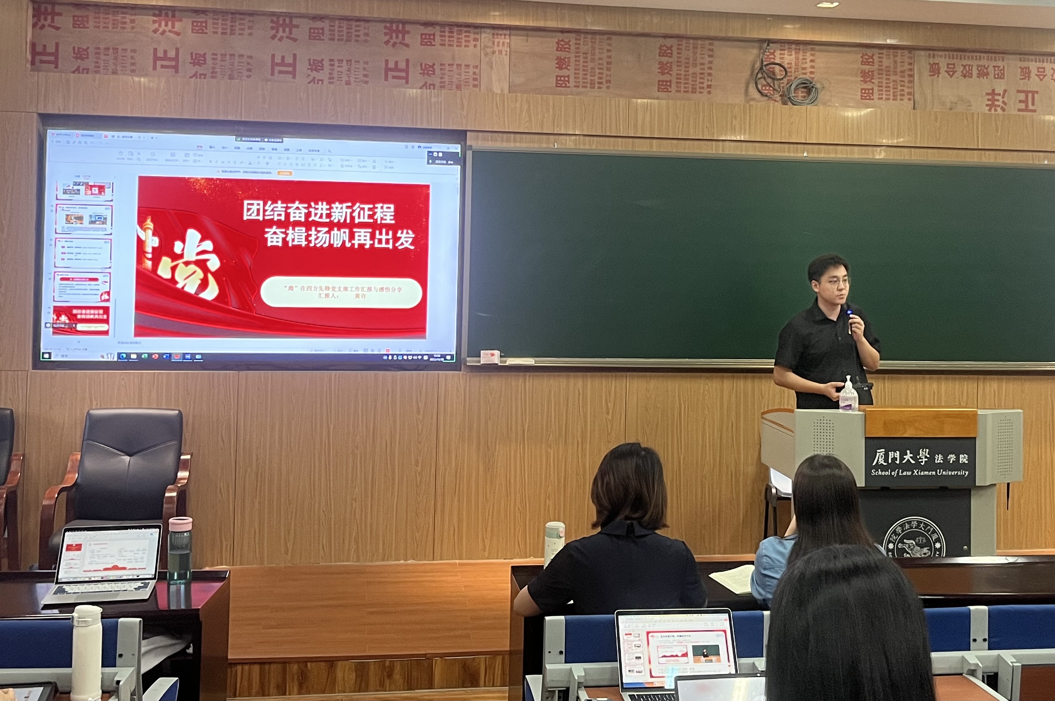 随后,“廌”在四方先锋党支部书记黄许作“团结奋进新征程,奋楫扬帆再出发”工作汇报与感悟分享。“廌”在四方先锋党支部突出党建创新、推进组织优化;坚持思想引领、明确政治方向;完善工作机制、提高运行效率;鼓励党员先行、促进融合发展。该支部开展了内容丰富、形式多样的活动,充分发挥了兼合式党支部的示范引领作用,为学生党支部开展“三会一课”“固定党日+”活动等提供了优秀示范。