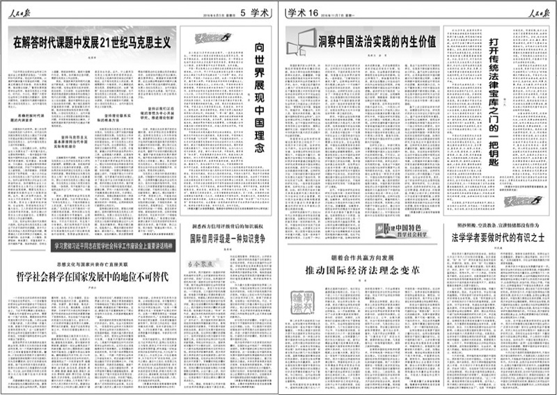 2016年6月5日和11月7日,《人民日报》学术版分别以“大家手笔”和“学苑论衡”为栏目名,刊载法学院陈安教授的两篇署名文章《向世界展现中国理念》以及《朝着合作共赢方向发展 推动国际经济法理念变革》。文章为2016年福建省中国特色社会主义理论体系研究中心委托省社科规划重点项目立项成果。