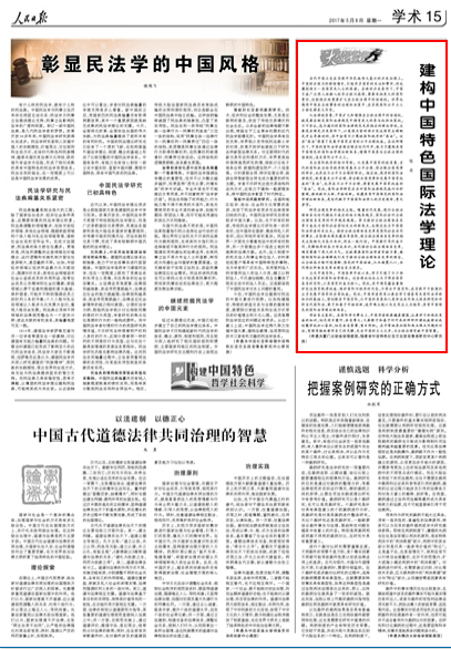 2017年5月8日,《人民日报》第十五版(学术)再度以“大家手笔”为栏目名,刊载我院陈安教授理论文章《建构中国特色国际法学理论》。此前,《人民日报》学术版曾分别以“大家手笔”和“学苑论衡”为栏目名,刊载法学院陈安教授的两篇理论文章。
