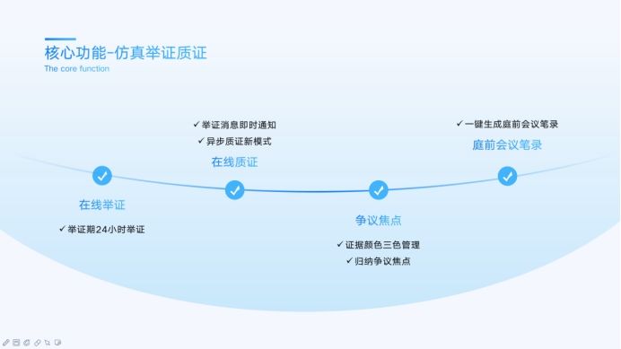 模拟当事人,通过平台进行庭前的证据上传,双方完成异步举证;模拟合议庭对案件争议焦点在线展开评议并形成庭前会议笔录,学会分析案件的举证责任和争议焦点。