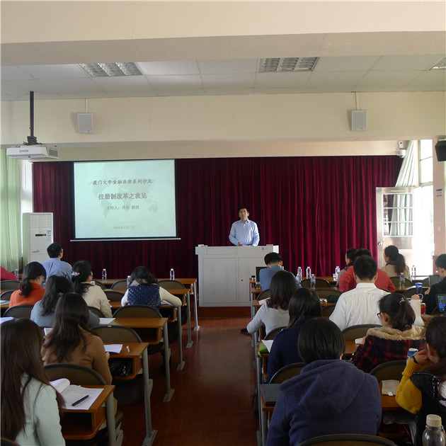 2014年12月7日上午9点,厦门大学法学院金融法律系列沙龙在我院A栋302教室拉开序幕,本次沙龙主题为“注册制改革之我见”,由经济法教研室的肖伟教授主持。本次沙龙的主要参与者是来自我院不同专业和年级的硕士、博士研究生,同时还特别邀请了我院金融法方向硕士班的校外导师和多位实务界专家共同参与本次活动。