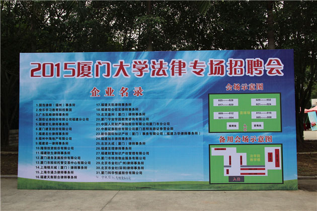 为促进法学院毕业生就业、提高法学院毕业生就业率,并协助用人单位招聘法律人才,厦门大学法学院于12月12日在法学院海滨篮球场举行2015法律专场招聘会。本次活动吸引了北京盈科(厦门)律师事务所、北京市金杜(广州)律师事务所、福建天衡联合律师事务所、厦门建发有限股份公司、国信证券股份有限公司福建分公司、中国人民财产保险股份有限公司厦门市分公司等32家企业前来招聘,招聘现场气氛热烈。