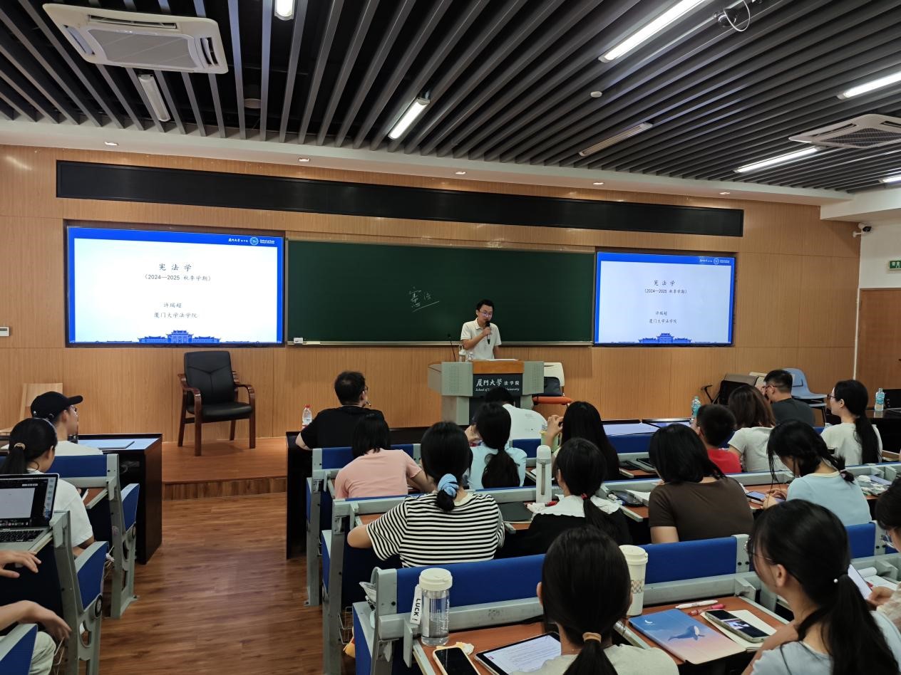 法学院院长陈鹏教授向同学们简要介绍许瑞超老师的学术经历与科研成果,热烈欢迎他以厦门大学教师身份走上讲台。希望许老师扎根讲台,努力践行教书育人的使命,培养出更多优秀的法律人才。