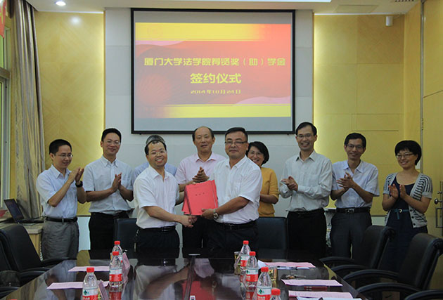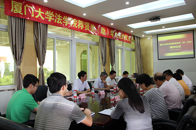10月24日下午15时许,厦门大学法学院荐贤奖(助)学金签约仪式在我院B519隆重举行。本次大会共邀请了91级硕士彭晋平校友、05级博士施高翔校友、 95级硕士李辉东校友、 96级硕士邓小荣校友、06级博士郑贤宇校友等五位知名校友参与此次会议。我院党委书记李智勇、教授齐树洁、副院长何丽新、党委副书记周蕾、党委副书记郭锦星出席了此次会议,一同参与的还有学院部分教师和学生代表。党委副书记郭锦星任此次会议的主持人。