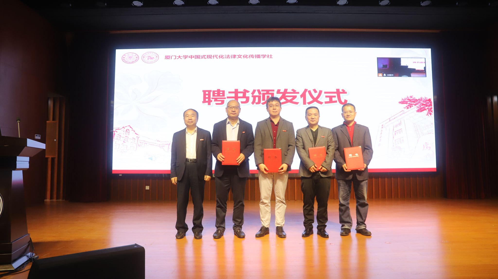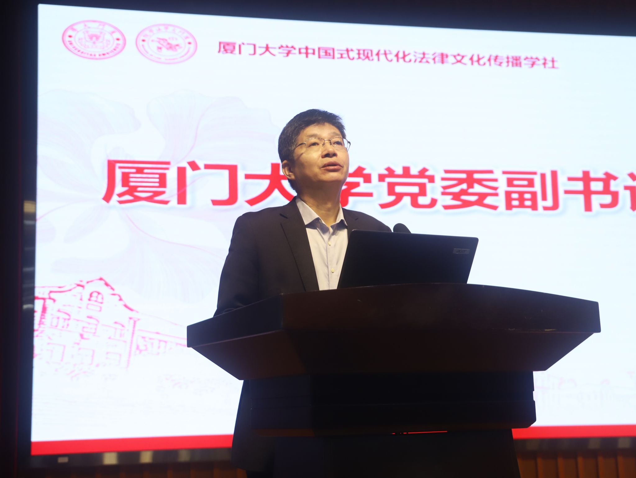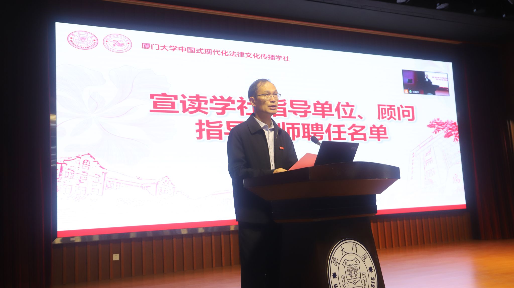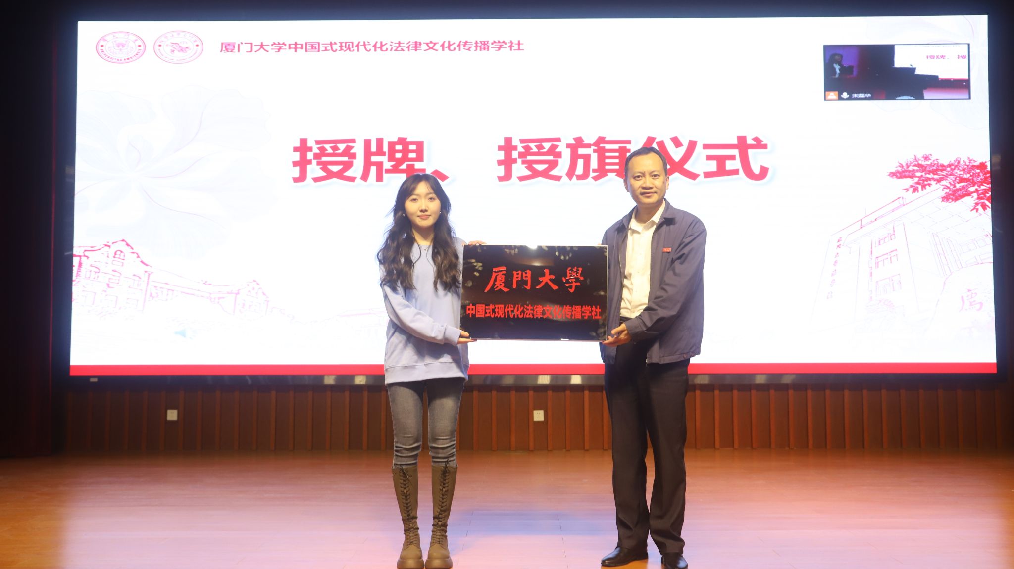 厦门大学党委学工部部长李峰向法律文化传播学社授牌,厦门大学团委书记洪海松向法律文化传播学社授旗。