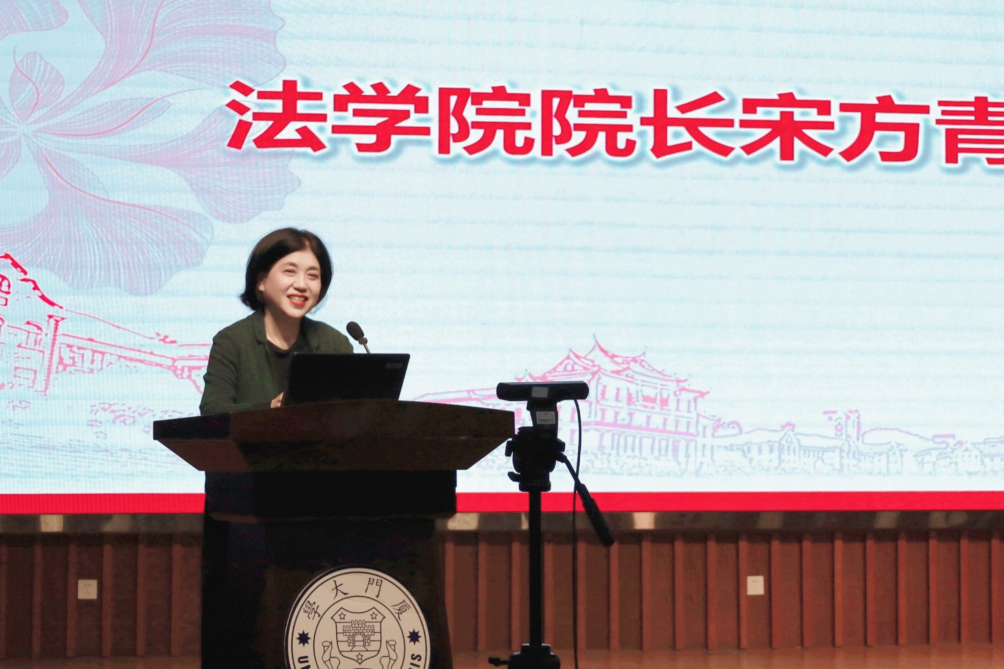 厦门大学党委副书记徐进功致辞。他介绍了厦门大学在社会主义法治文化建设方面开展的工作,强调了传播法律文化、弘扬法治精神的重要性,肯定了中国式现代化法律文化传播学社成立的重要意义。他提出,希望法律文化传播学社坚守社会主义法治文化的“中国立场”,结合中国实际、适应中国国情、解决中国问题,希望学社传承社会主义法治文化的“中国基因”,通过“青言青语”对中华优秀传统法律文化进行创造性转化和创新性发展,做到走向大众、深入人心,希望学社唱响社会主义法治文化的“中国声音”,将抽象的文本转化成向大众传播普及的生动精神食粮,不断拓展传播渠道。希望同学们通过法律文化传播学社的平台,不断加强自身对法治理论的培养深度、法治思维的训练广度和法治精神的孕育温度,努力成为德法兼修的新时代法治人才。