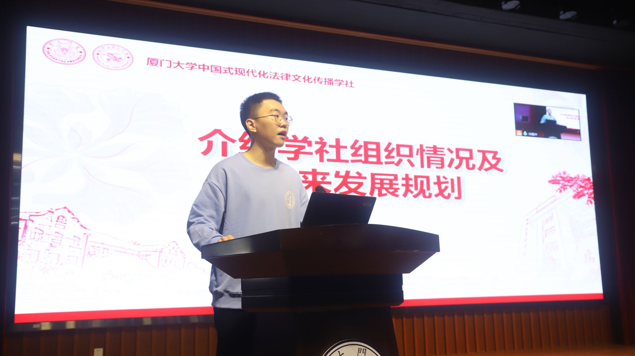 首任社长、2022级硕士研究生林晏泽介绍了法律文化传播学社的组织架构和章程,并从加强理论素养、提升实践能力、打造精品项目等方面介绍了学社的发展规划,表示将团结带领社员把学社建设好、发展好,为社会主义法治国家建设贡献应有的力量。