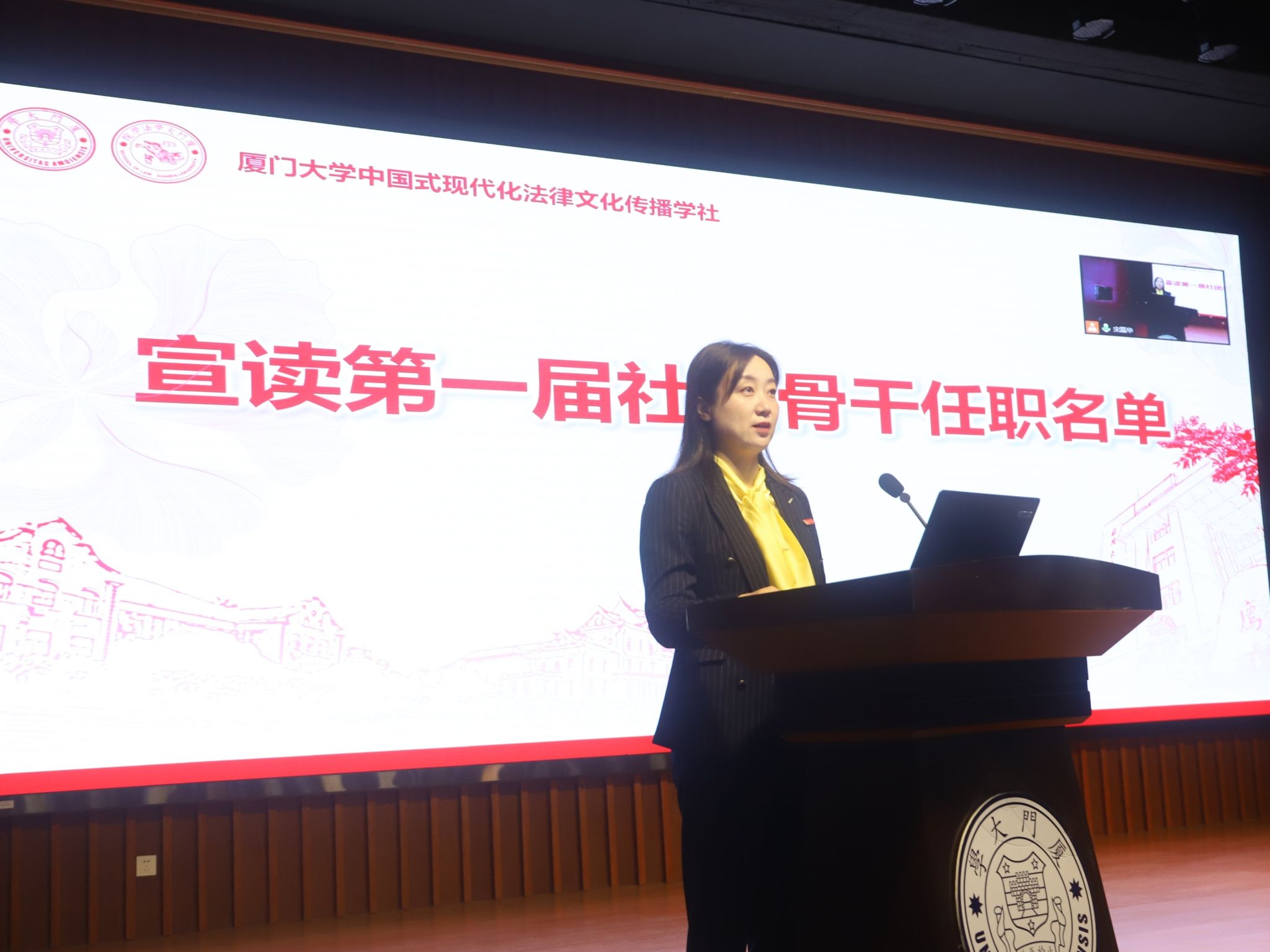 法学院党委副书记吴荻宣读社团骨干任职名单。根据《厦门大学中国式现代化法律文化传播学社章程》,经本人申请、组织考察等程序,决定任命林晏泽等13位同学为法律文化传播学社第一届骨干成员。